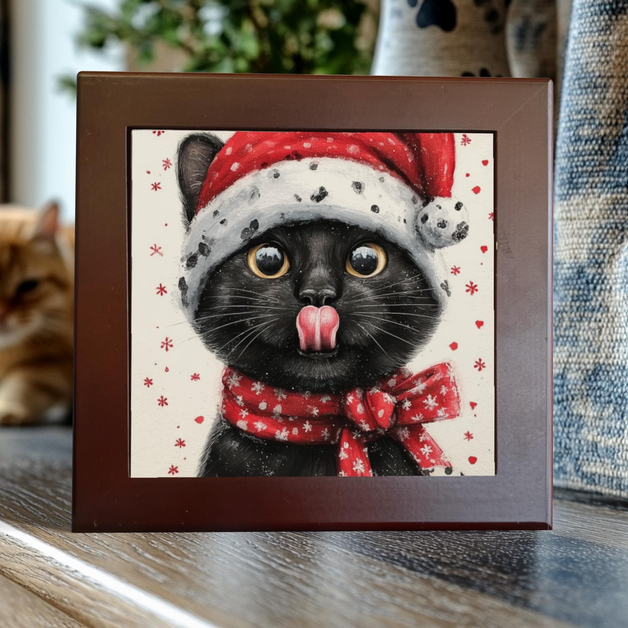 Black Cat with Tongue Out – Christmas Cat Porcelain Tile