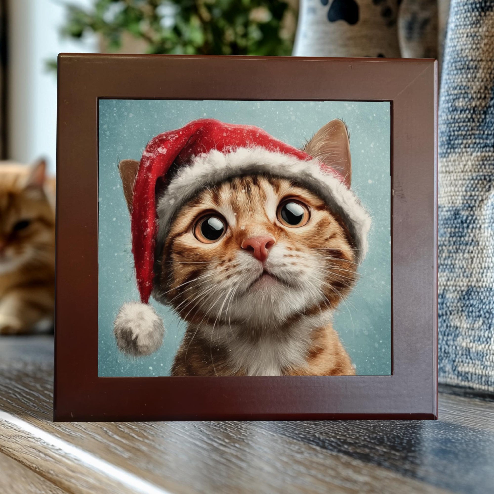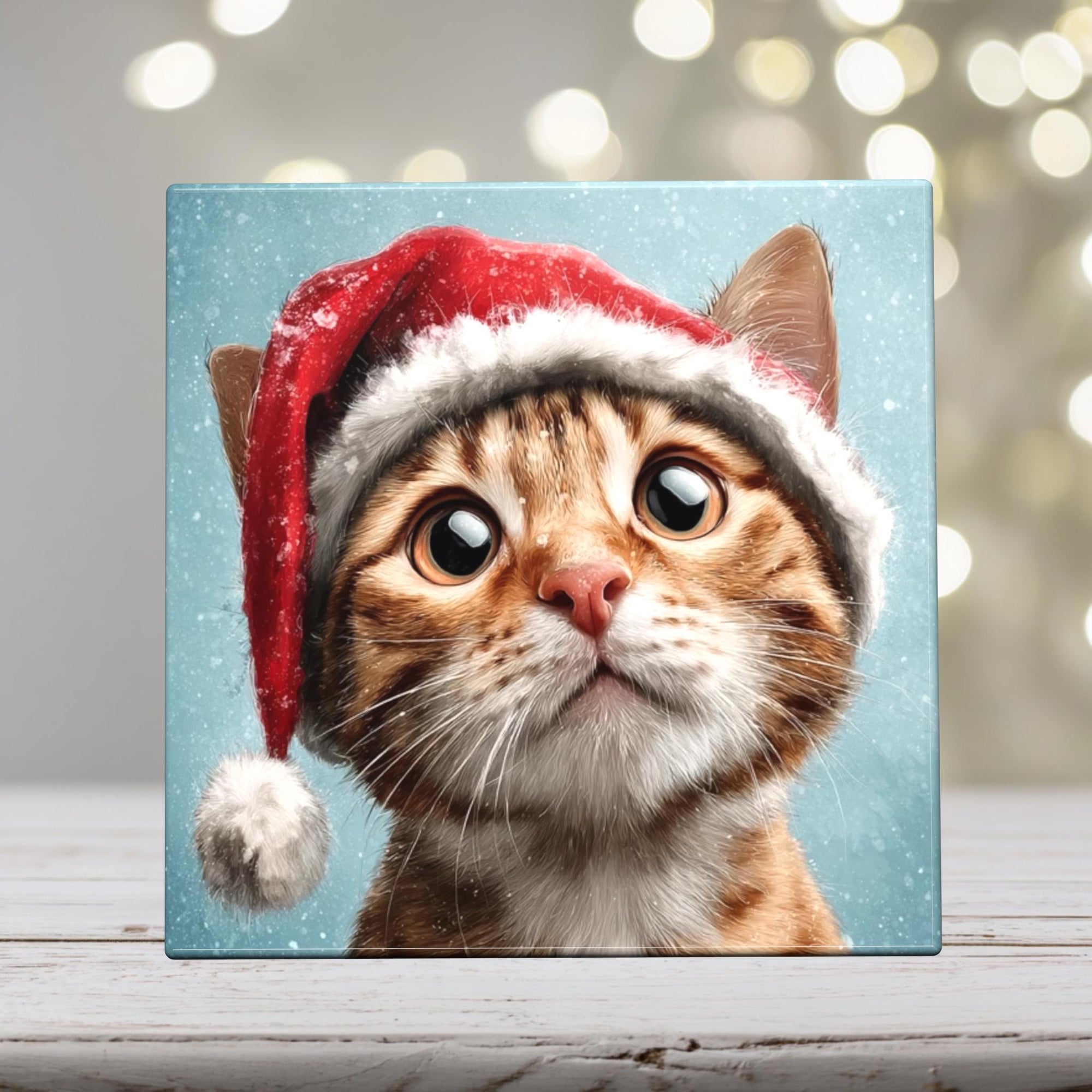 Brown Cat in Santa Hat – Christmas Cat Porcelain Tile