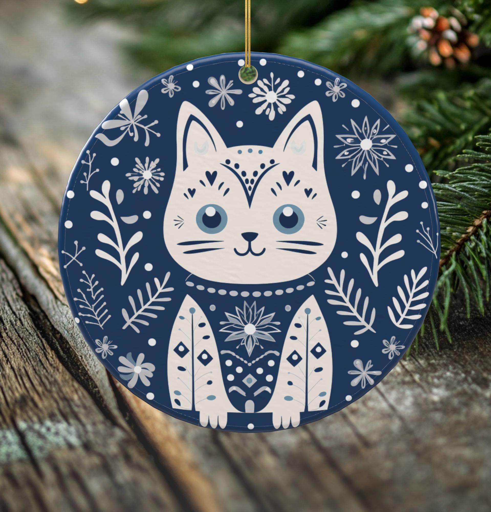 Festive Cat Porcelain Christmas Ornament - Double-Sided Whimsical Keepsake -- Scandinavian Style