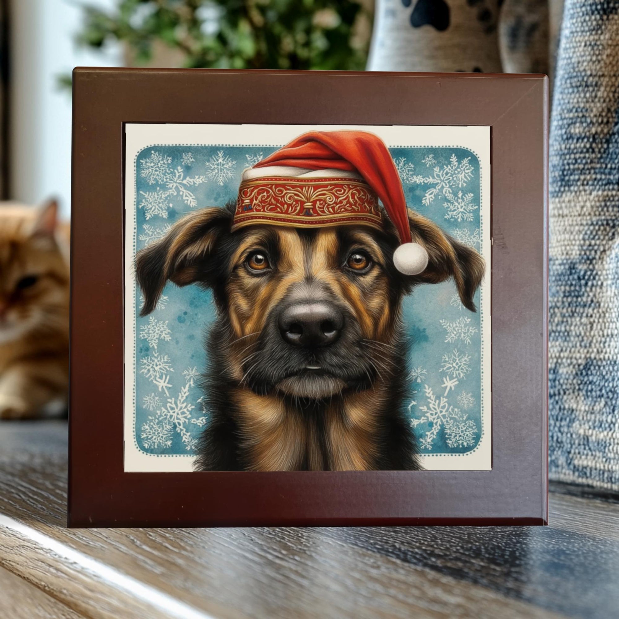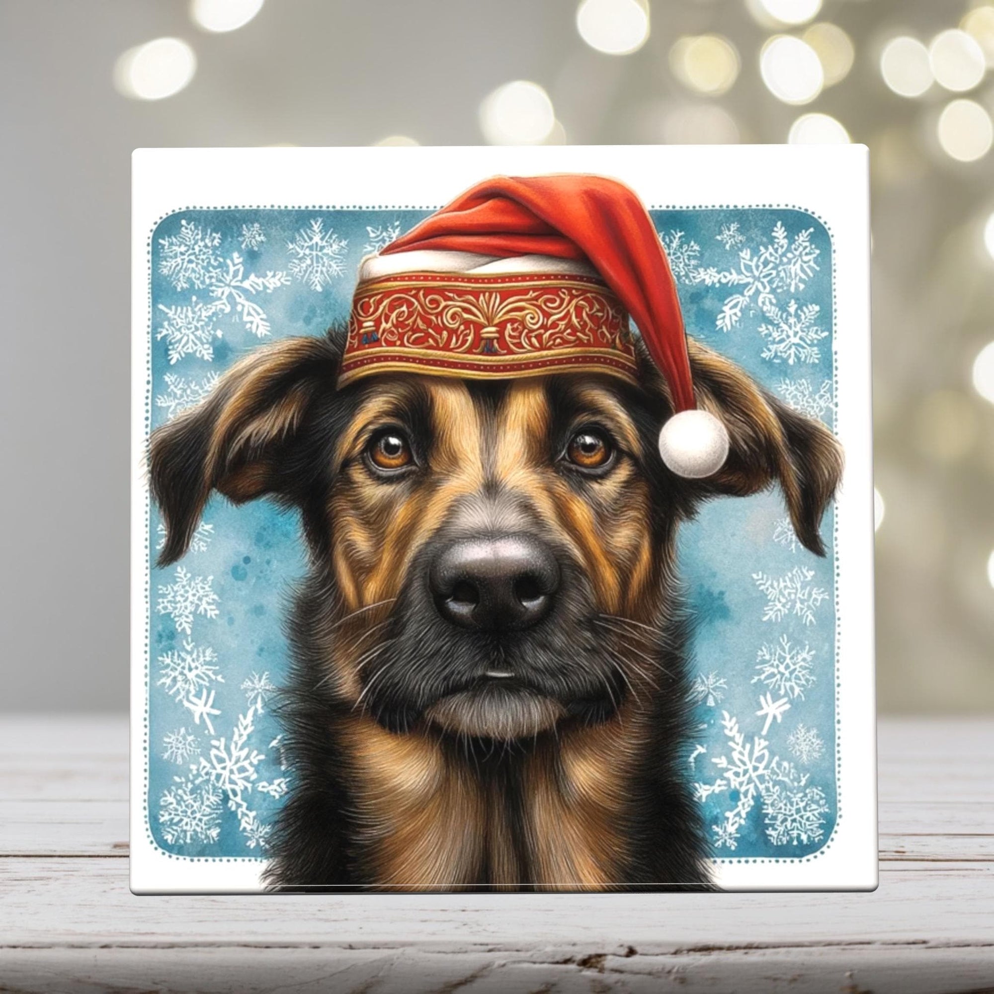 Mixed Breed Dog in Red Christmas Hat – Christmas Dog Art Tile