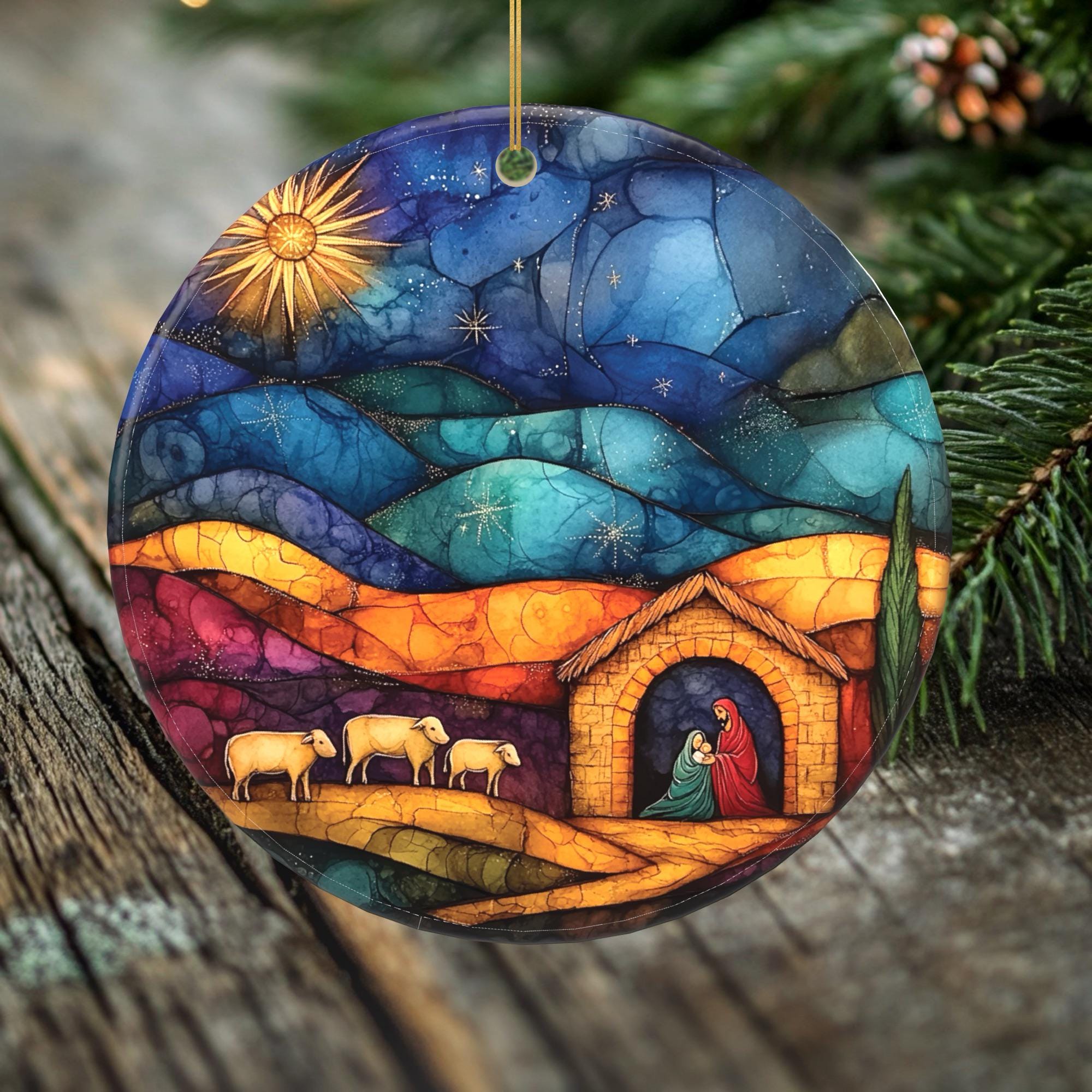 Celebrate the birth of Christ with this beautifully handcrafted porcelain ornament, depicting the serene Nativity scene with Mary, Joseph, and baby Jesus under a star-filled night sky. With its vivid colors and layered matte and gloss finishes, this nearly 3-inch double-sided ornament adds depth and richness to your holiday decorations. Designed to be a treasured heirloom, this ornament is a meaningful addition to any Christmas tree and a perfect gift to commemorate the true spirit of the season.
