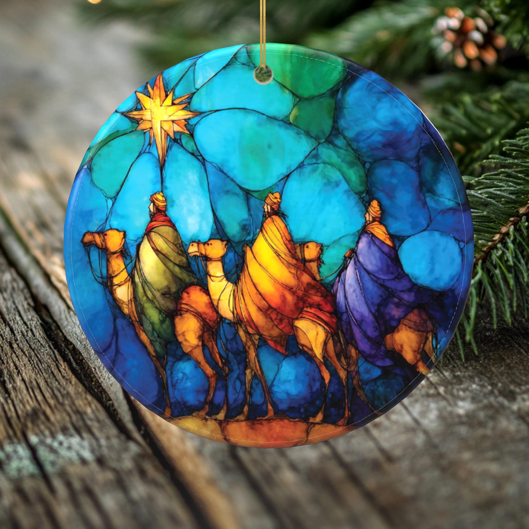 Bring the story of Christmas to life with this handcrafted porcelain ornament, featuring original artwork in a stunning stained-glass style. Vivid colors, rich textures, and double-sided detail make each piece a small masterpiece worthy of display year after year. Whether adorning your tree or given as a meaningful gift, this ornament adds a sense of reverence, beauty, and warmth to your holiday season. Each is printed on high-quality porcelain with layered ink and gloss for an heirloom-quality finish.
