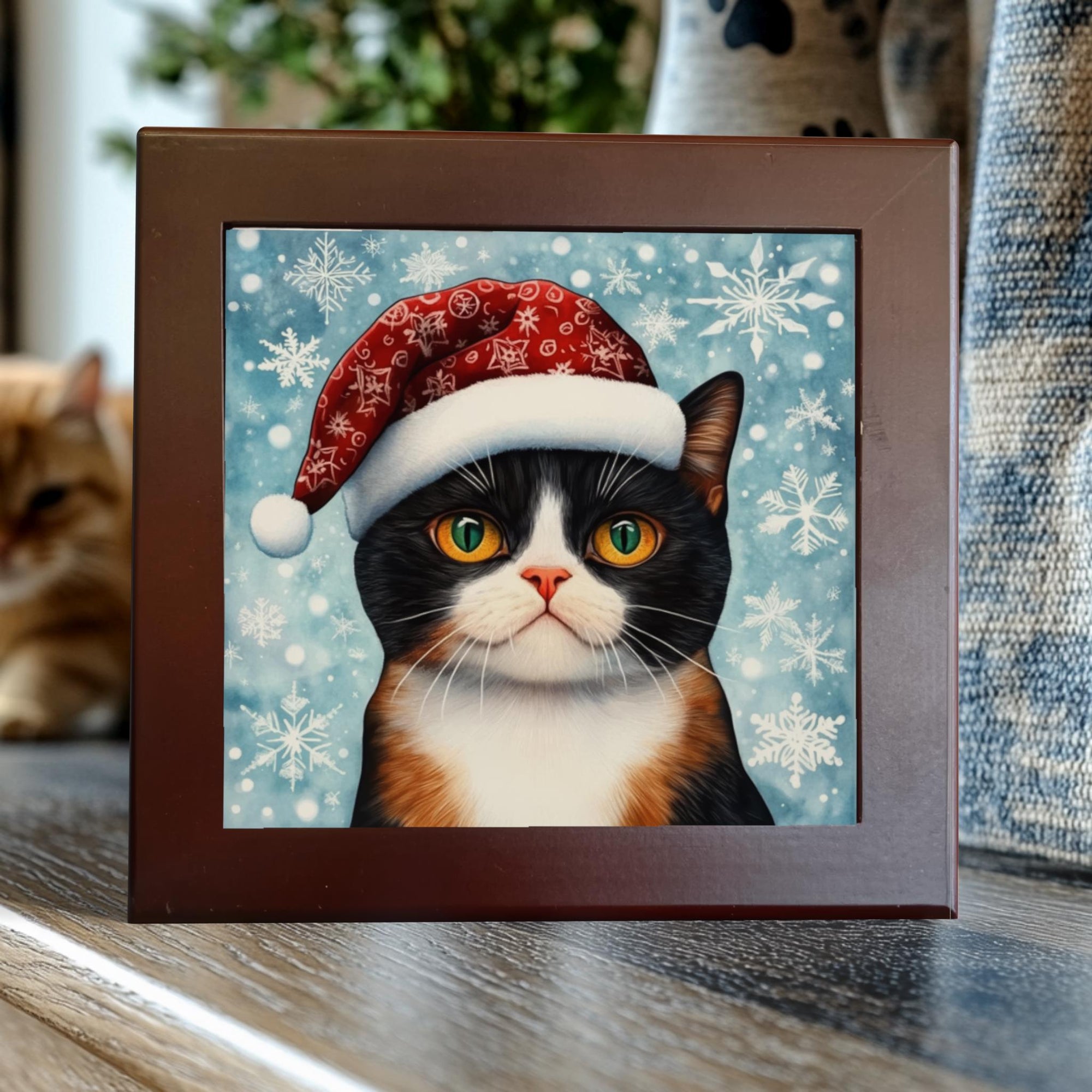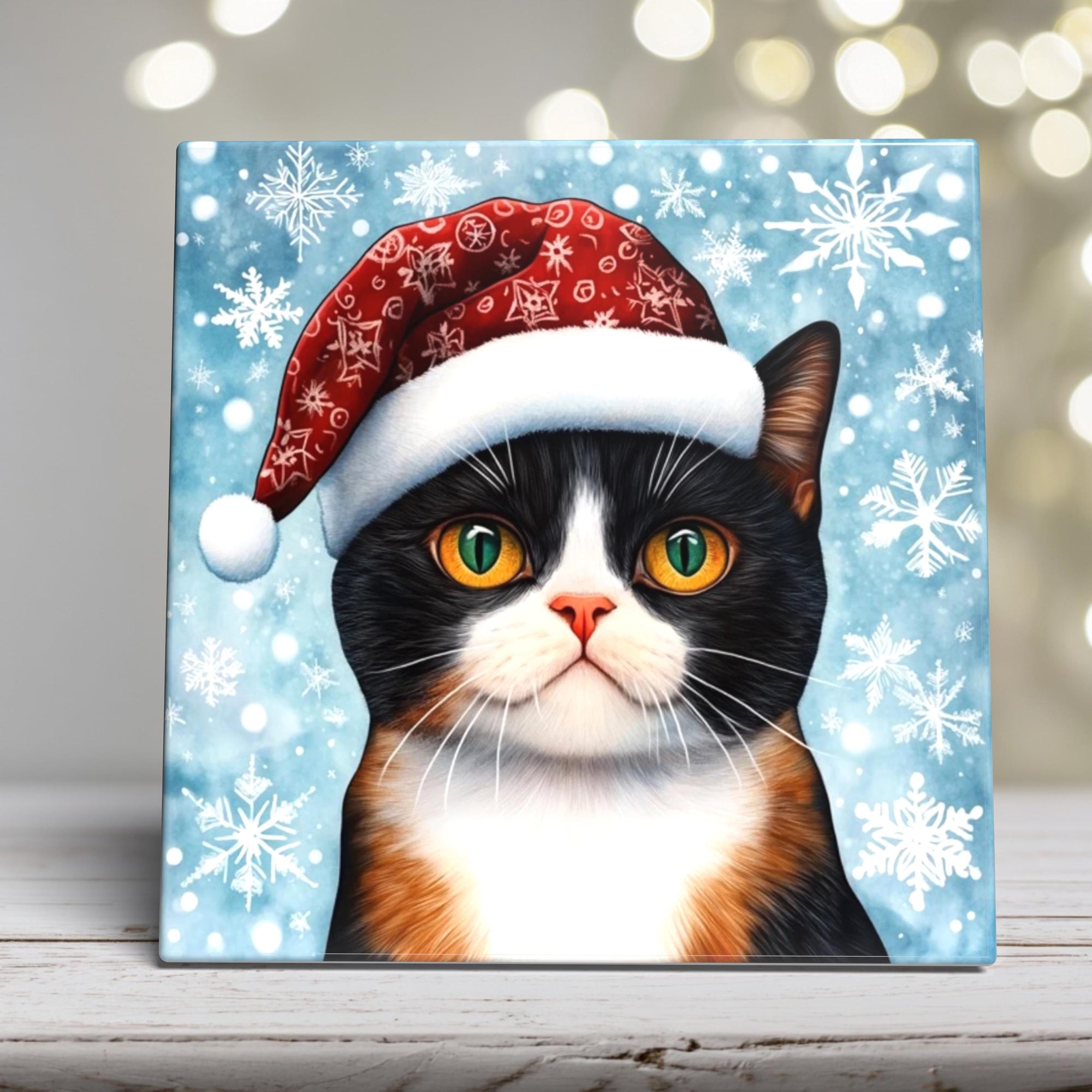 Tortoiseshell Cat in Santa Hat – Christmas Cat Porcelain Tile