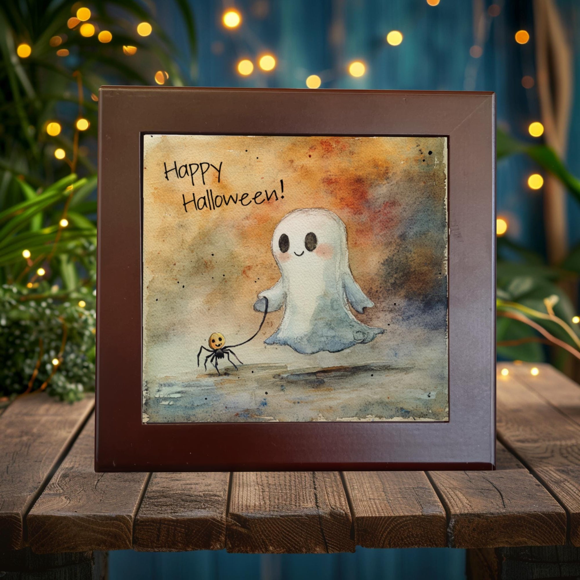 Add a touch of whimsy to your Halloween decor with this charming handcrafted porcelain tile featuring an adorable ghost and its friendly spider companion. The playful scene is brought to life with a watercolor-style background, where the happy ghost takes its spider friend for a walk, spreading smiles and a lighthearted “Happy Halloween!” message. The design is printed with 7-9 layers of ink, providing a soft, textured appearance that beautifully complements the high-quality porcelain tile.