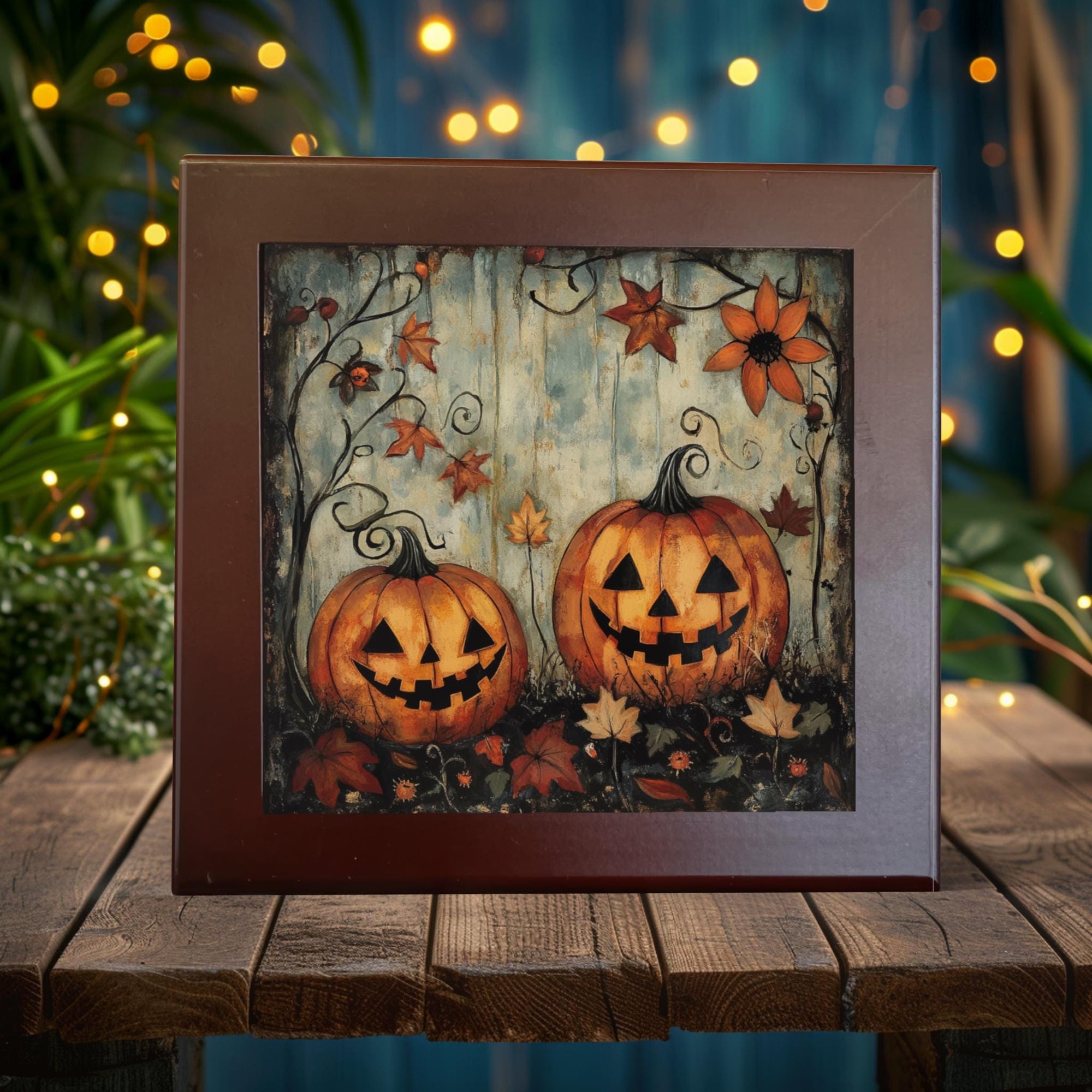 Celebrate the cozy charm of autumn with this delightful handcrafted porcelain tile featuring a pair of whimsical jack-o’-lanterns. Perfect for Halloween and fall decor, this 6-inch tile is brought to life with incredibly vivid colors and a rich layering process—most tiles boast 7-9 layers of ink. The scene captures two grinning pumpkins nestled among swirling vines and autumn leaves, set against a rustic backdrop.