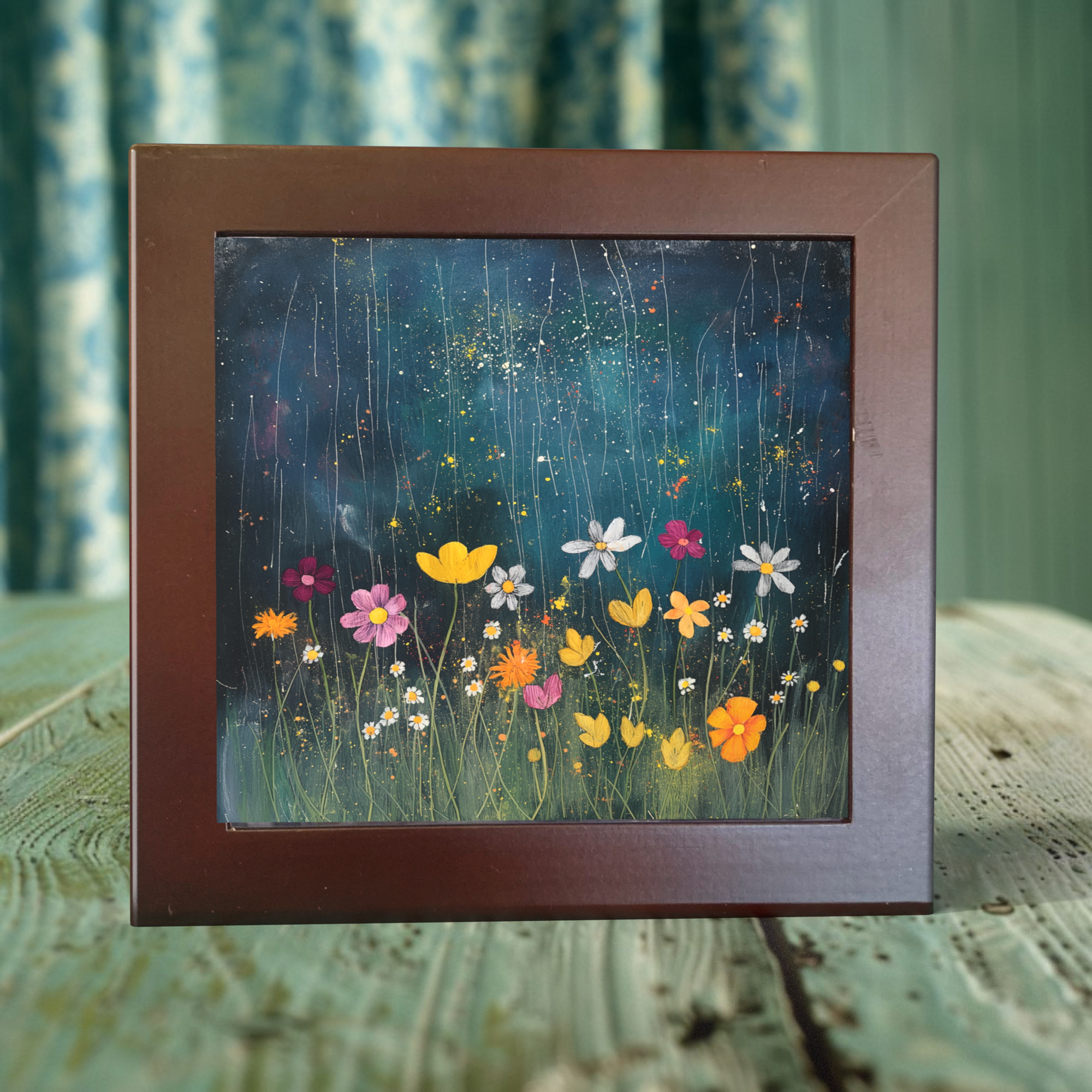 Celestial Wildflowers in the Rain on Porcelain Tile - 6” & 4” with Easel or Frame | Dual Finish Splendor