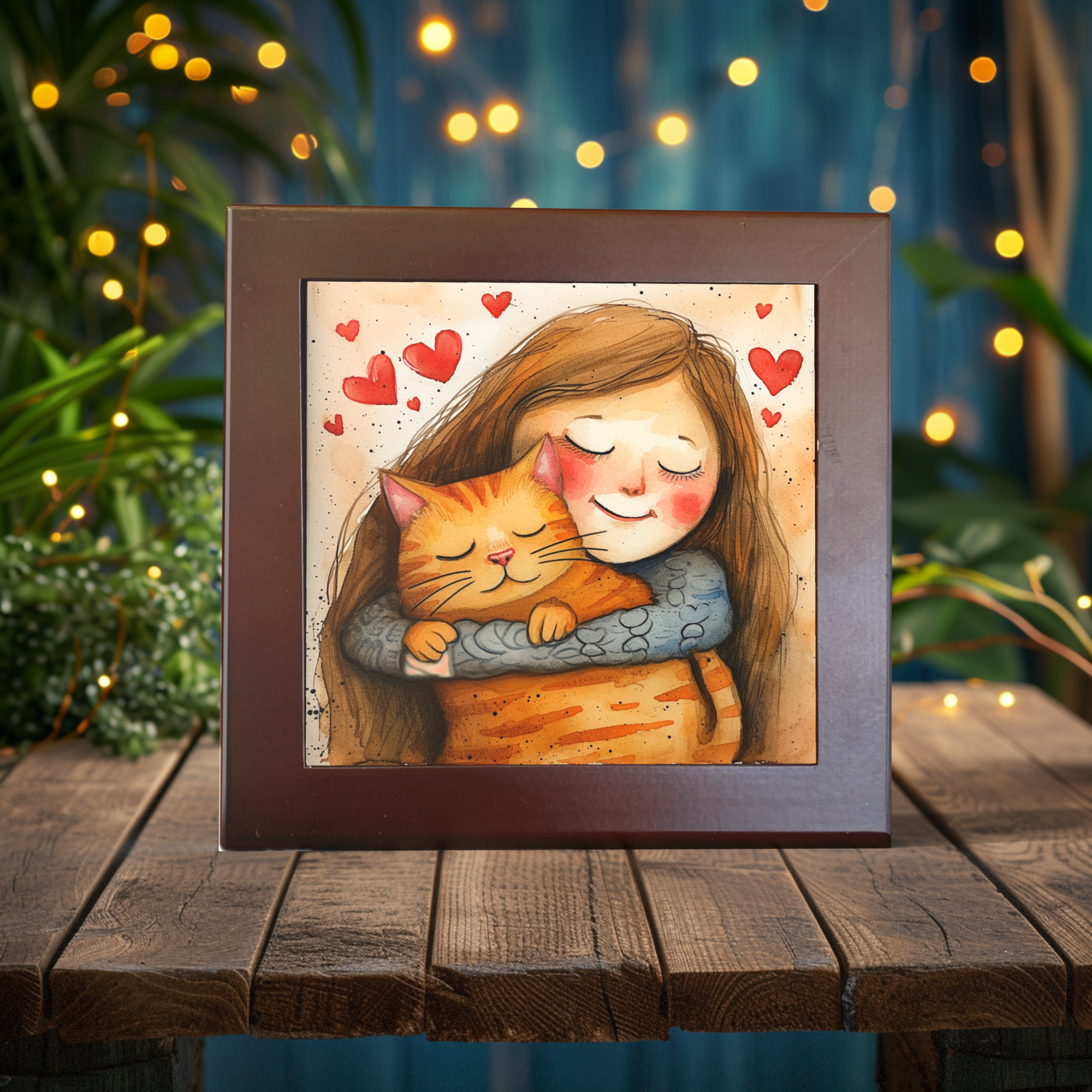 "Cozy Companions: Love in a Heartbeat" is a celebration of the silent conversations and comfortable embraces we share with our furry friends. This original artwork, splendidly captured on a ceramic tile, depicts the serenity of a girl and her cat in a moment of pure contentment and love.