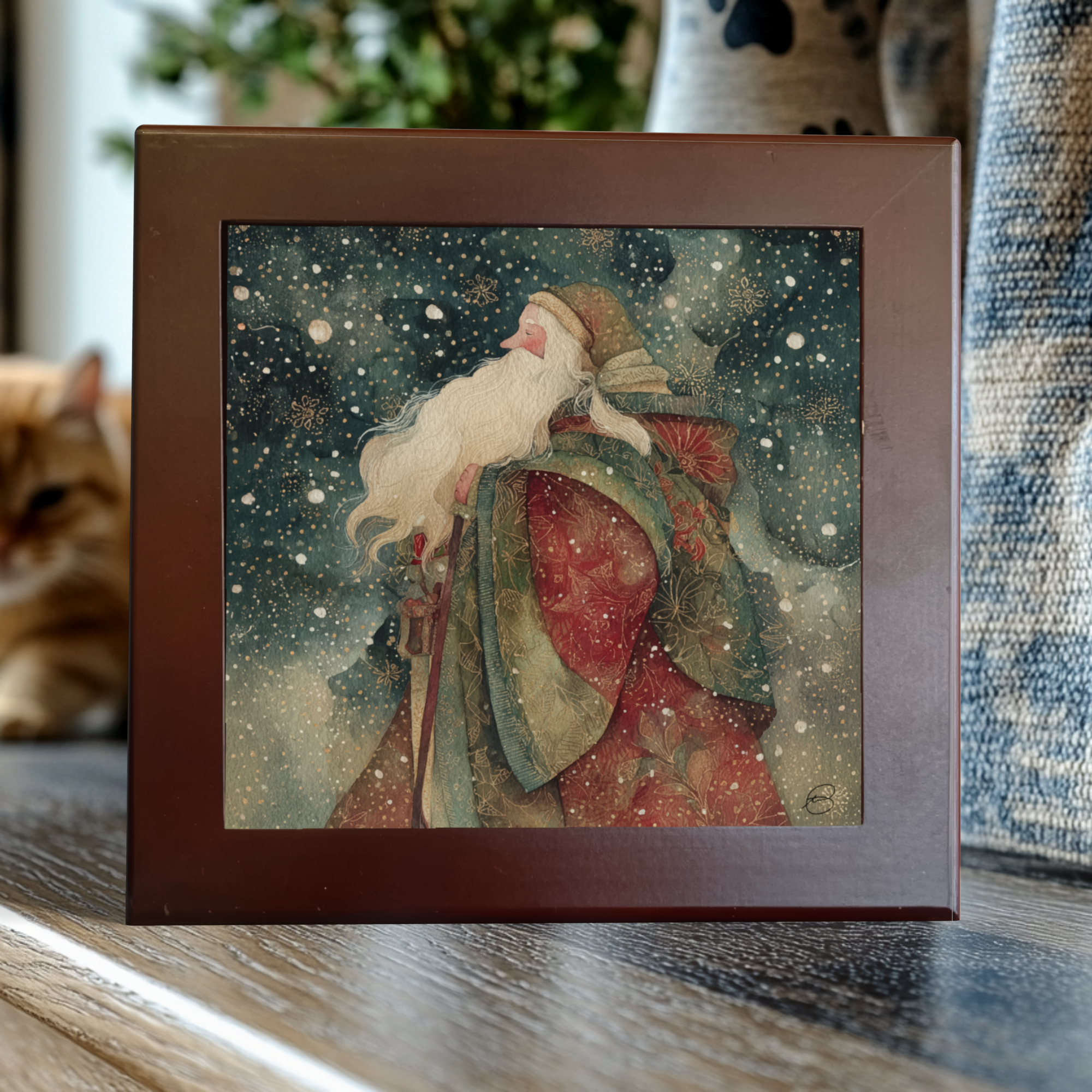 A quiet, snow-filled moment captured in porcelain. This Old World–inspired Santa tile features original artwork by Tad Hartmann, crafted on high-quality porcelain using layered inks and finishes for exceptional depth and texture. Rich winter tones and delicate detailing evoke the warmth and nostalgia of a traditional Christmas, creating a timeless piece designed to be displayed and treasured year after year.