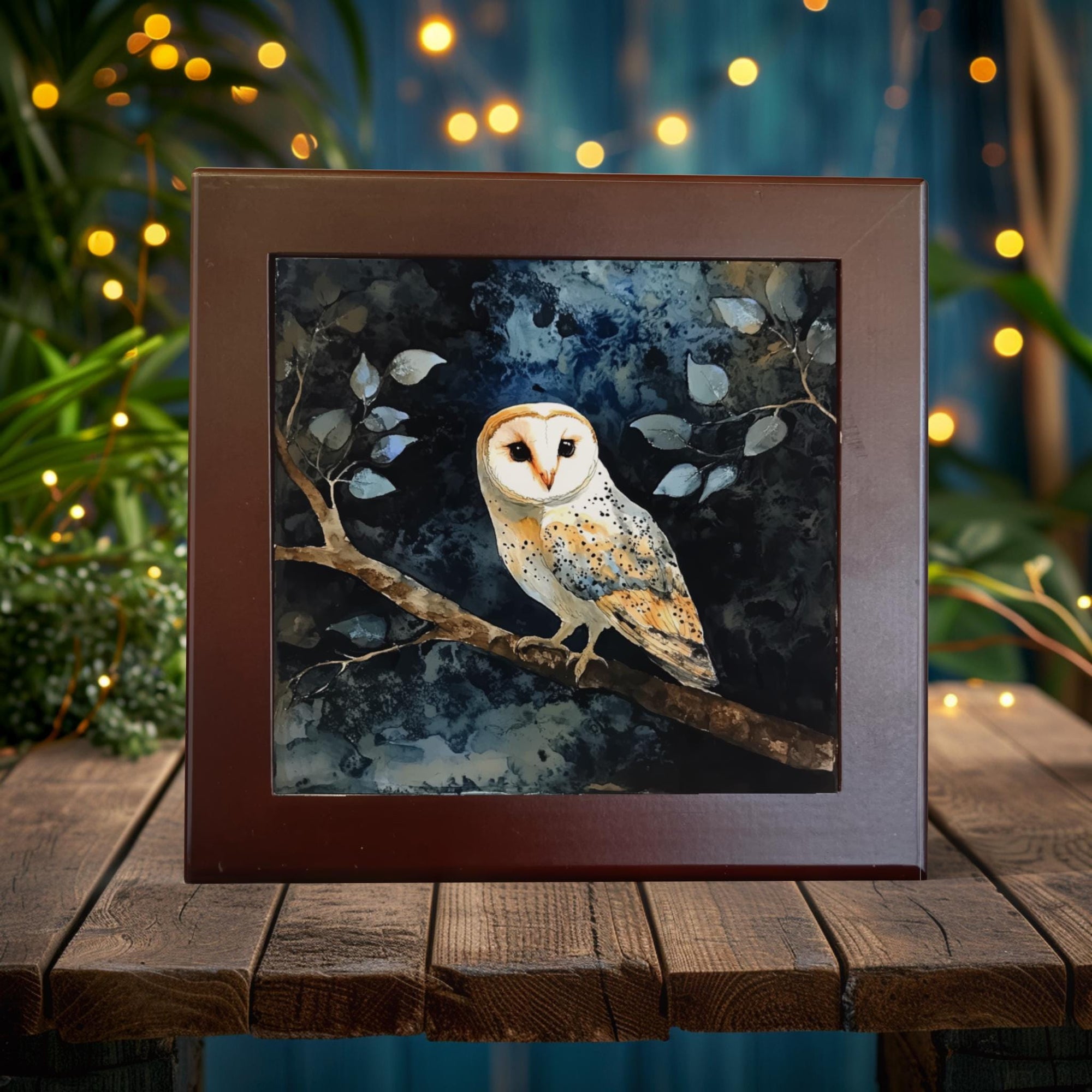 Introduce the quiet elegance of nature into your home with this exquisite handcrafted porcelain tile featuring a beautifully detailed barn owl perched on a branch under the soft glow of a moonlit night. The owl’s gentle gaze and the intricate patterns on its feathers are captured with exceptional precision, brought to life with 7-9 layers of ink that add depth and a lifelike quality to the artwork.