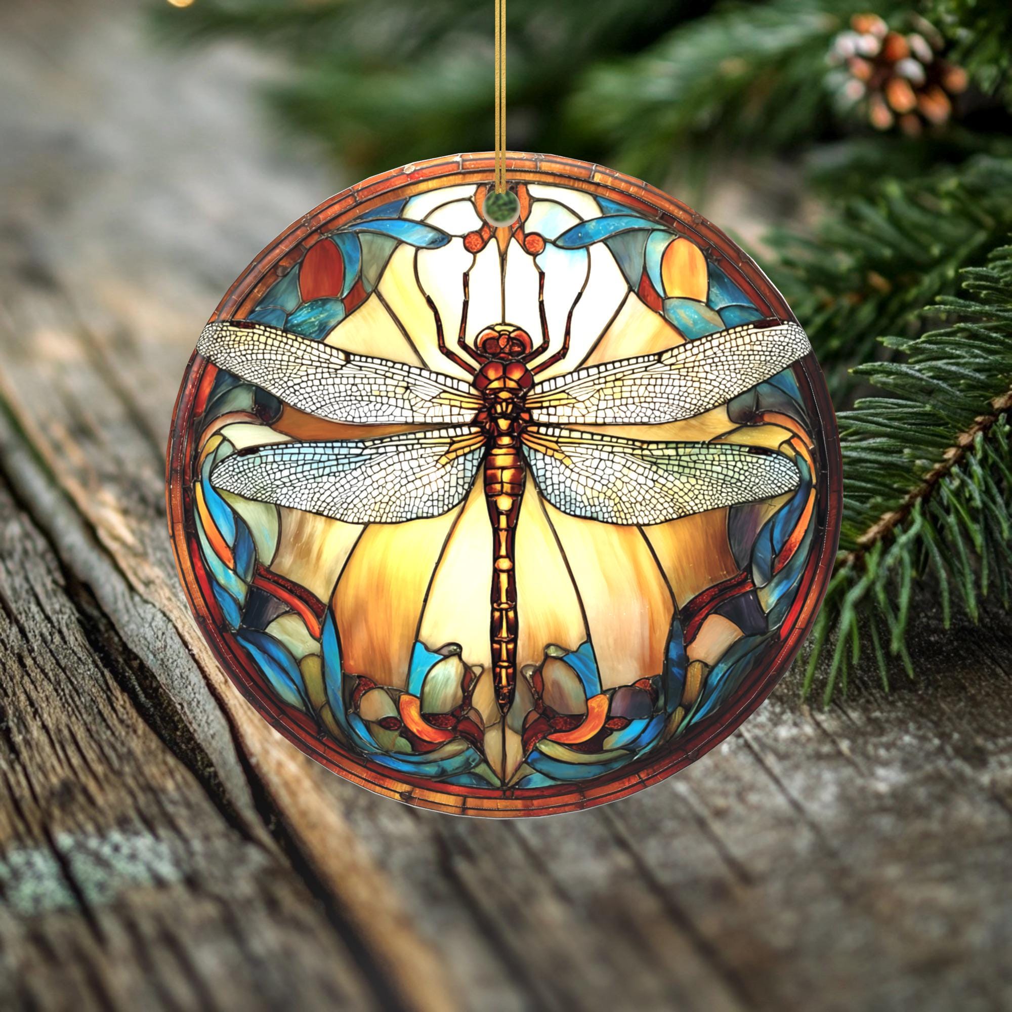 Golden Harmony Dragonfly Ornament – Double Sided Porcelain Keepsake – Stained Glass Look Memorial Gift