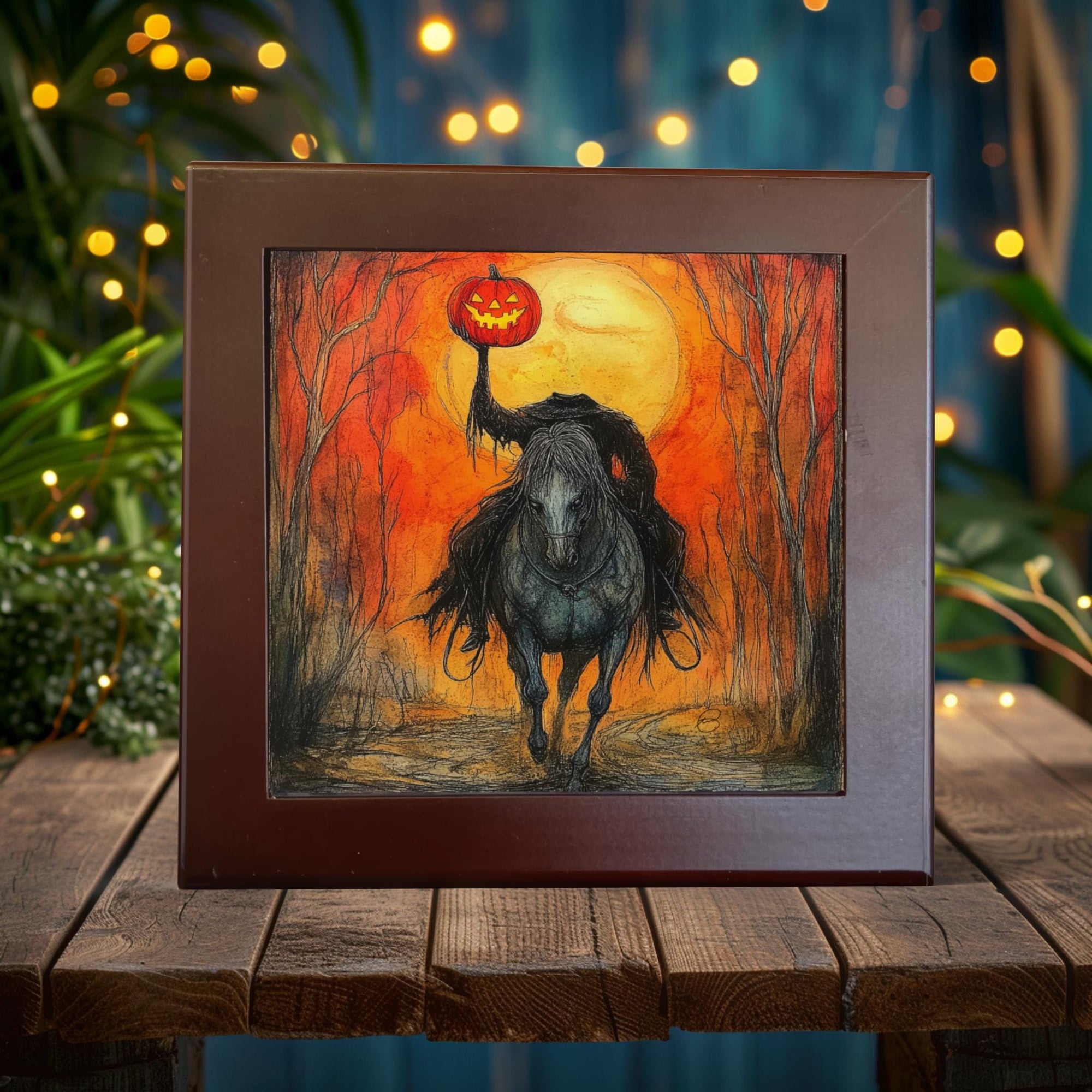 Step into the eerie world of Halloween legends with this captivating handcrafted porcelain tile featuring the iconic Headless Horseman. Against a backdrop of a fiery orange moonlit sky, the menacing figure rides his dark horse through a desolate forest, clutching a grinning jack-o’-lantern in place of his head. The scene is brought to life with incredible detail and vivid colors, achieved through a meticulous printing process that includes 7-9 layers of ink, giving the design a haunting depth and texture.