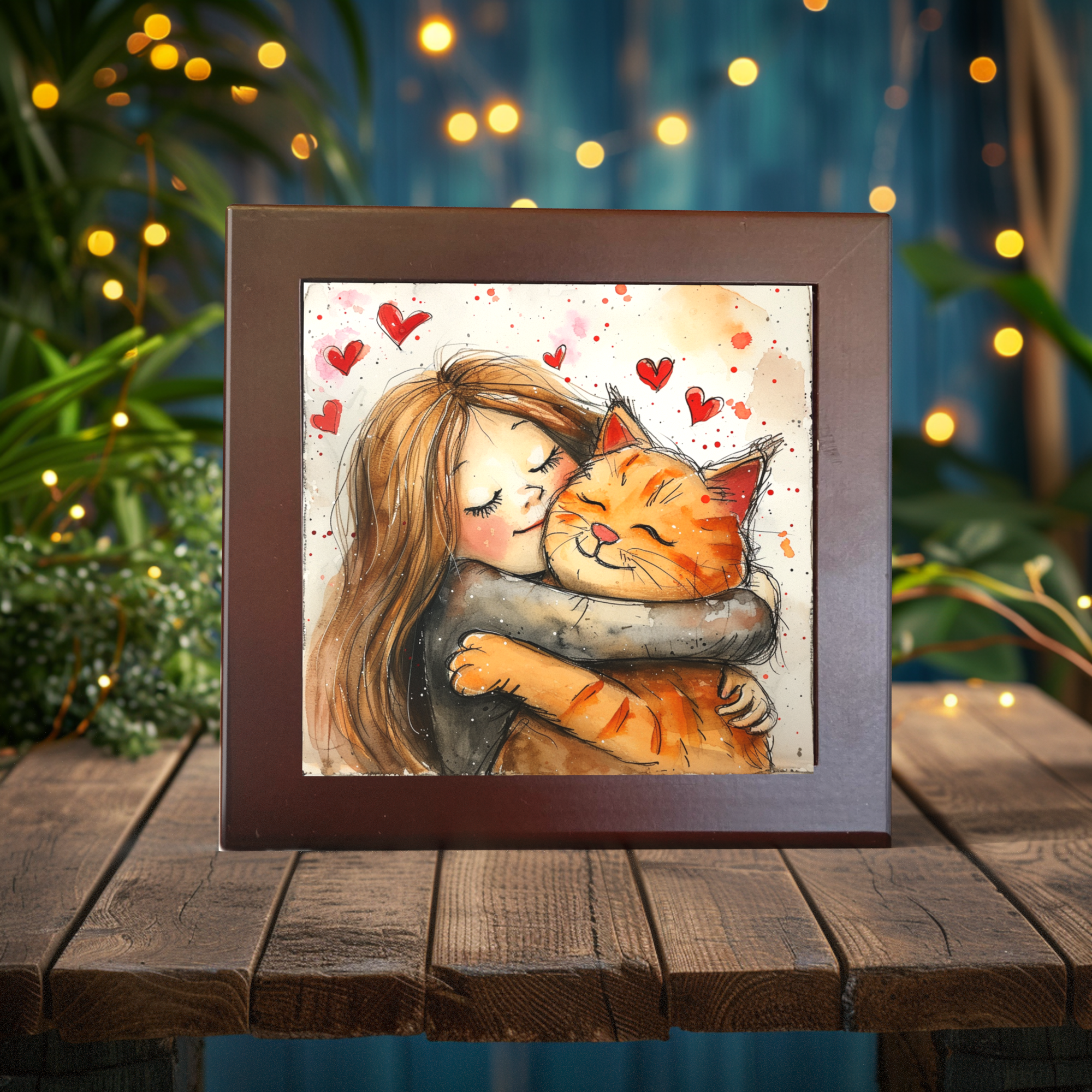 Our "Hug of Hearts: The Feline Embrace" ceramic tile captures the sweet bliss of a girl giving her beloved cat a tender hug. This original piece of art is a homage to the silent, yet powerful language of love that speaks volumes in the simple act of an embrace.