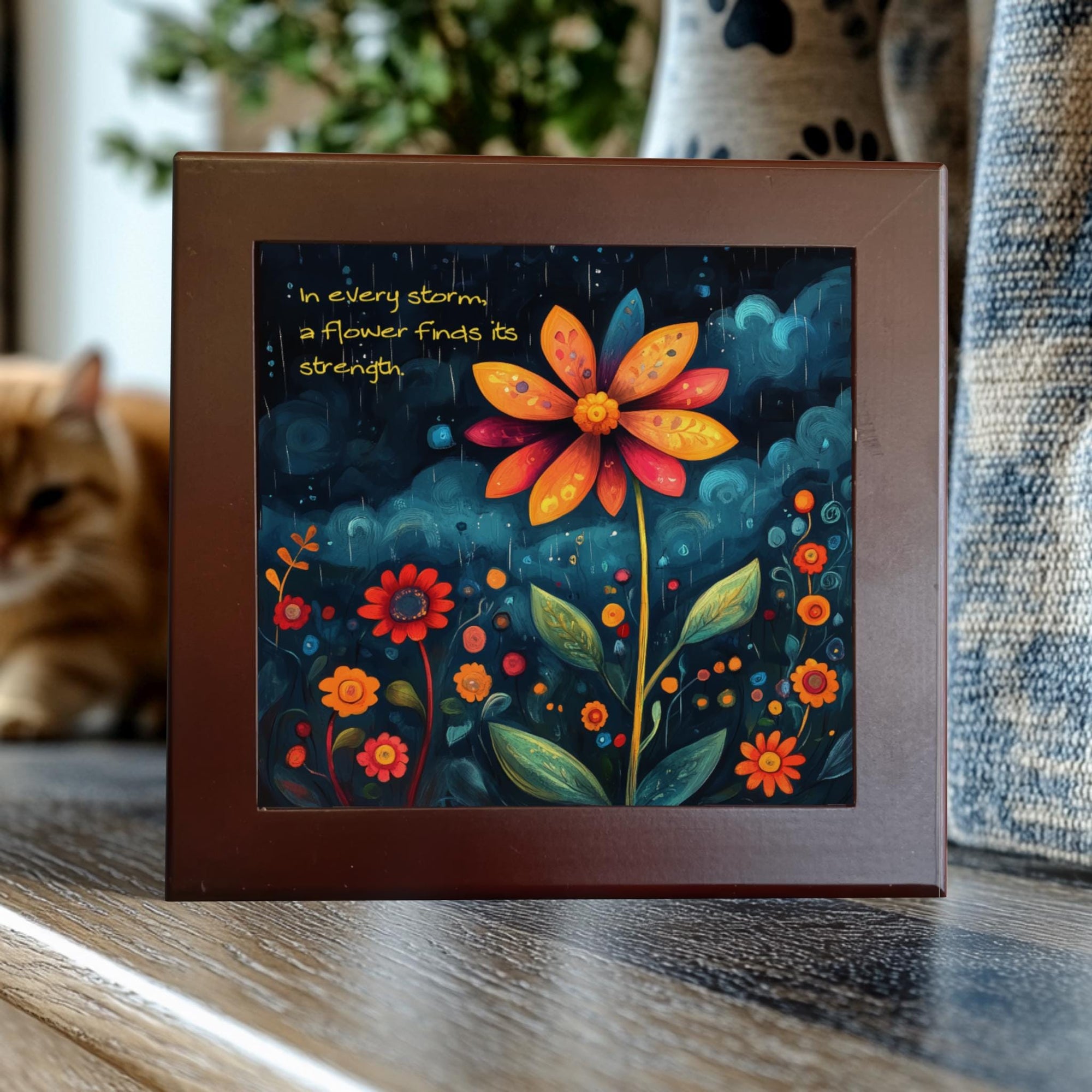Bring a message of hope and resilience into your home with this handcrafted ceramic tile featuring the original artwork of Tad Hartmann. The inspirational quote, “In every storm, a flower finds its strength,” paired with a bold and vibrant flower design, radiates positivity and courage.