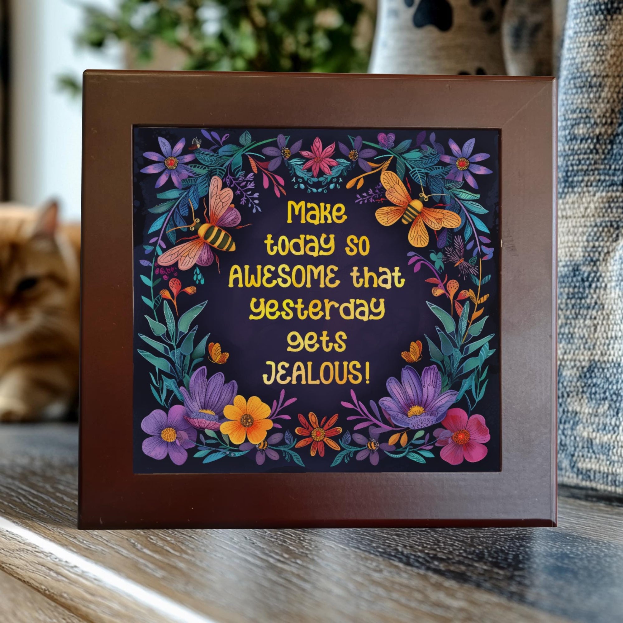 Brighten your day with this handcrafted ceramic tile featuring the original artwork of Tad Hartmann. The bold and colorful design, adorned with vibrant flowers and buzzing bees, frames the empowering phrase “Make today so awesome that yesterday gets jealous!”, making it a perfect reminder to embrace positivity and live with enthusiasm.
