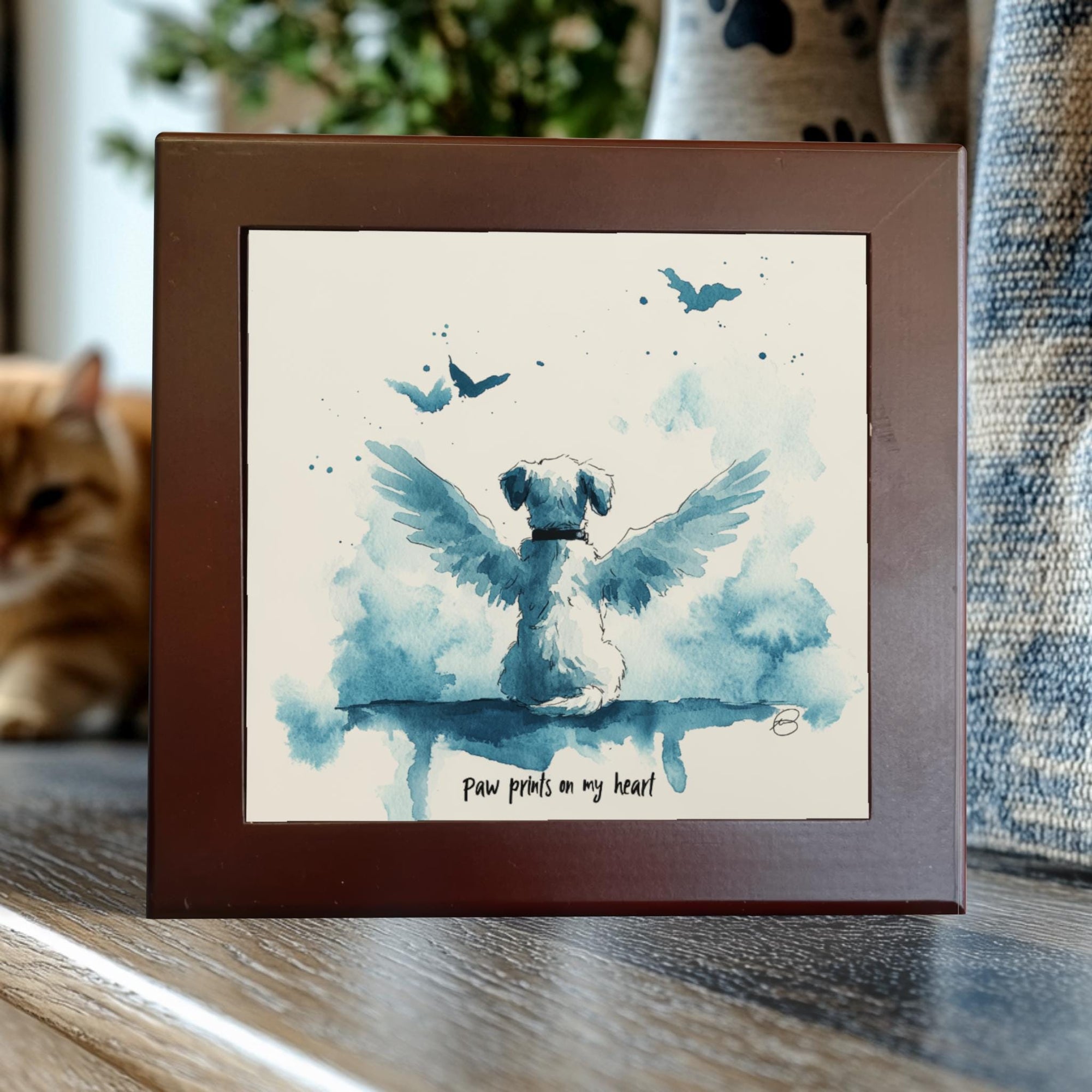 Celebrate the unconditional love and lasting memories of a cherished dog with this handcrafted ceramic tile featuring the original artwork of Tad Hartmann. The serene design, showcasing a soulful dog with angelic wings and the heartfelt phrase “Paw prints on my heart,” is a beautiful tribute to the special bond shared with a beloved canine companion.