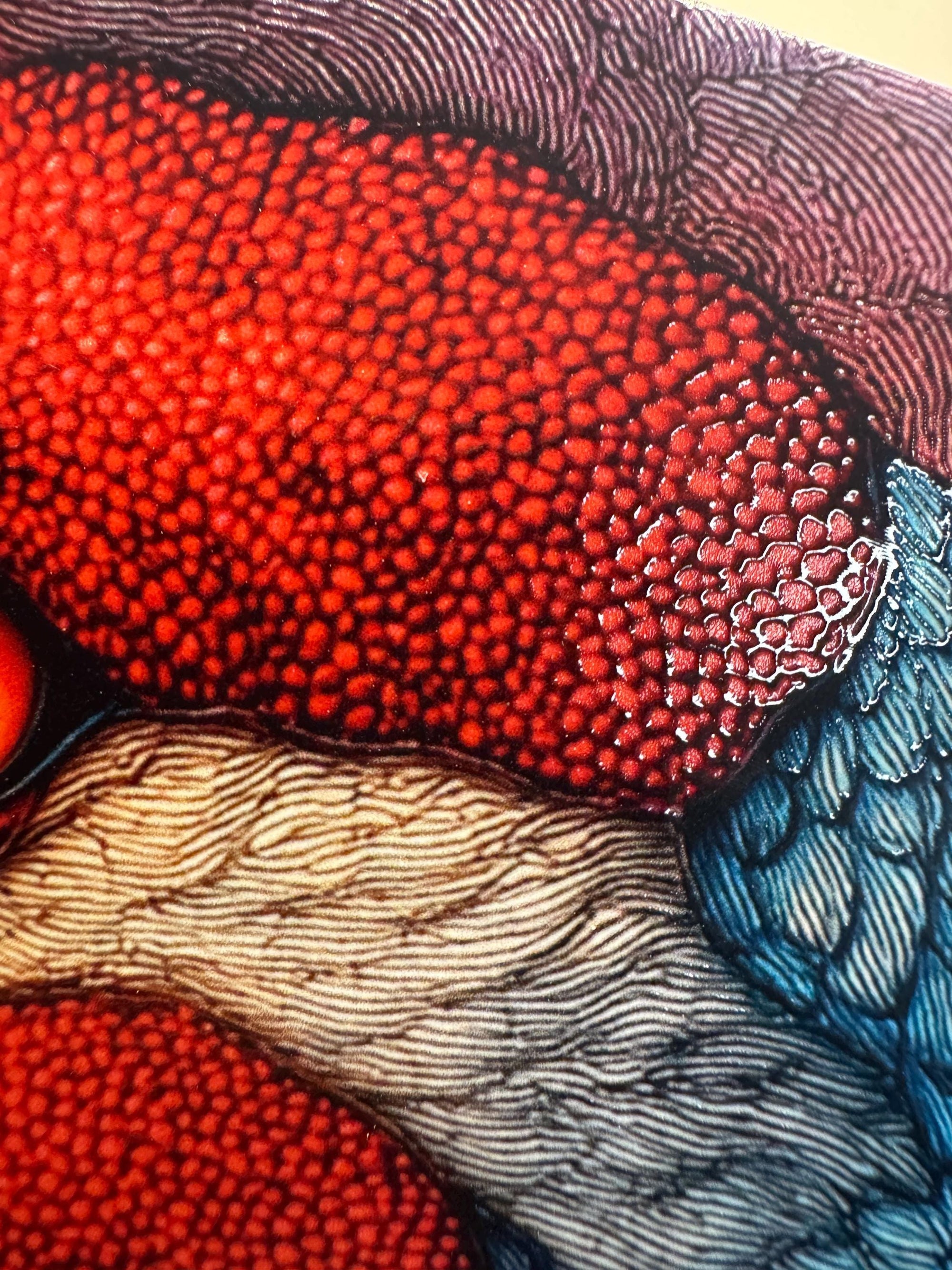 Using multiple layers of ink and gloss, each tile is built up with tactile depth you can feel. Feathers shimmer, backgrounds ripple, and edges lift subtly off the surface. While the effect is stunning in photos, it becomes almost magical in person—bringing each bird to life with a dimensional quality that’s both visual and touchable.