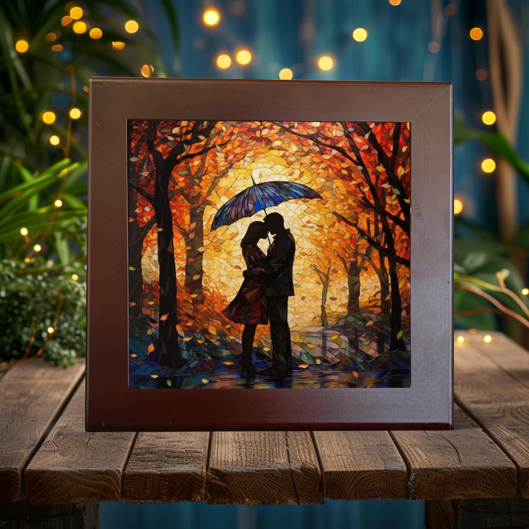 Capture the essence of romance with this breathtaking handcrafted porcelain tile featuring a stunning stained glass-inspired design of lovers embracing under an umbrella in a vibrant autumn forest. The warm hues of orange, red, and gold leaves create a glowing backdrop, while the couple’s silhouette adds an intimate touch to this evocative scene. The intricate design is brought to life with 7-9 layers of ink, providing a rich depth and texture that beautifully complements the high-quality porcelain tile.