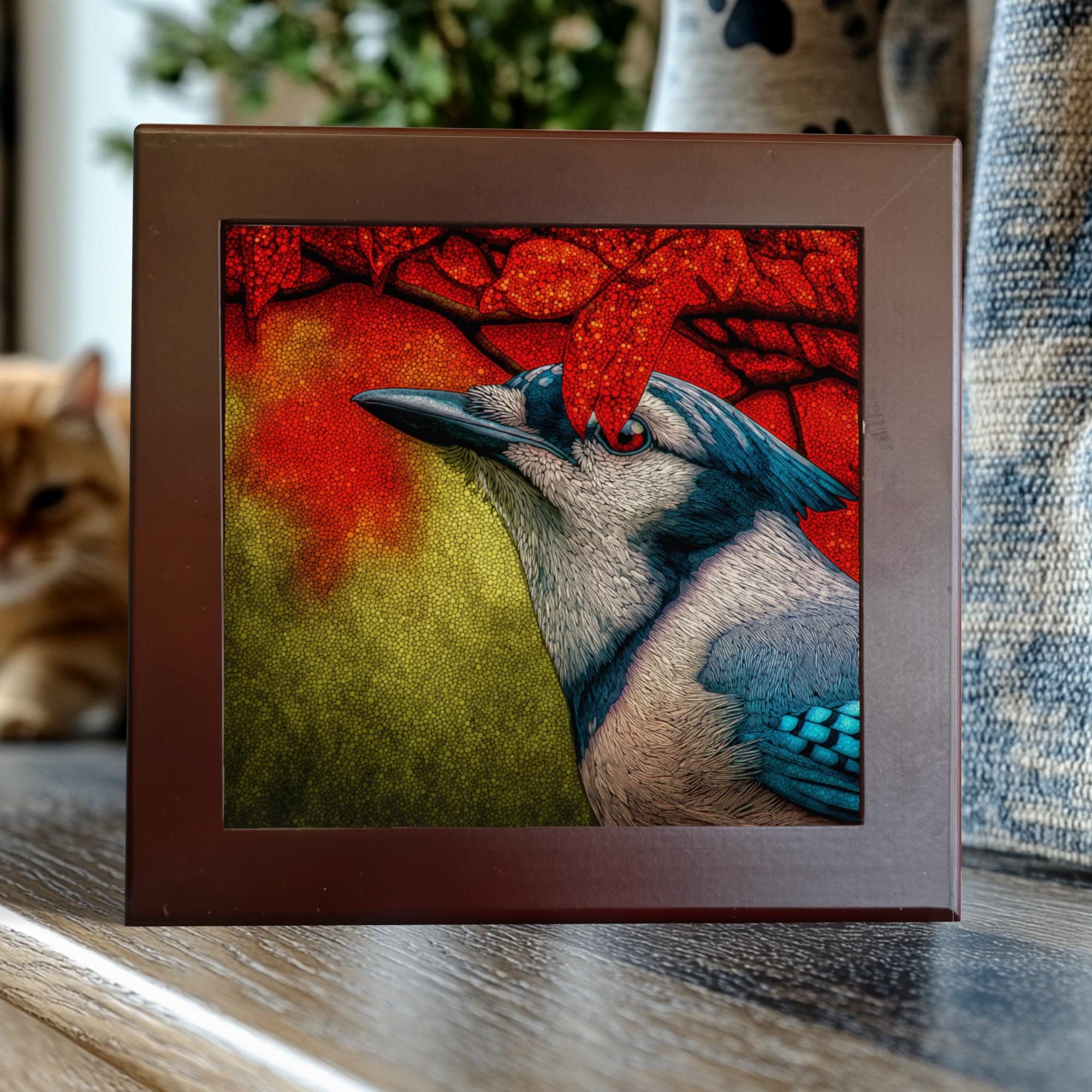 Sassy Blue Jay & Autumn Leaves – Bold Bird Art on Porcelain Tile