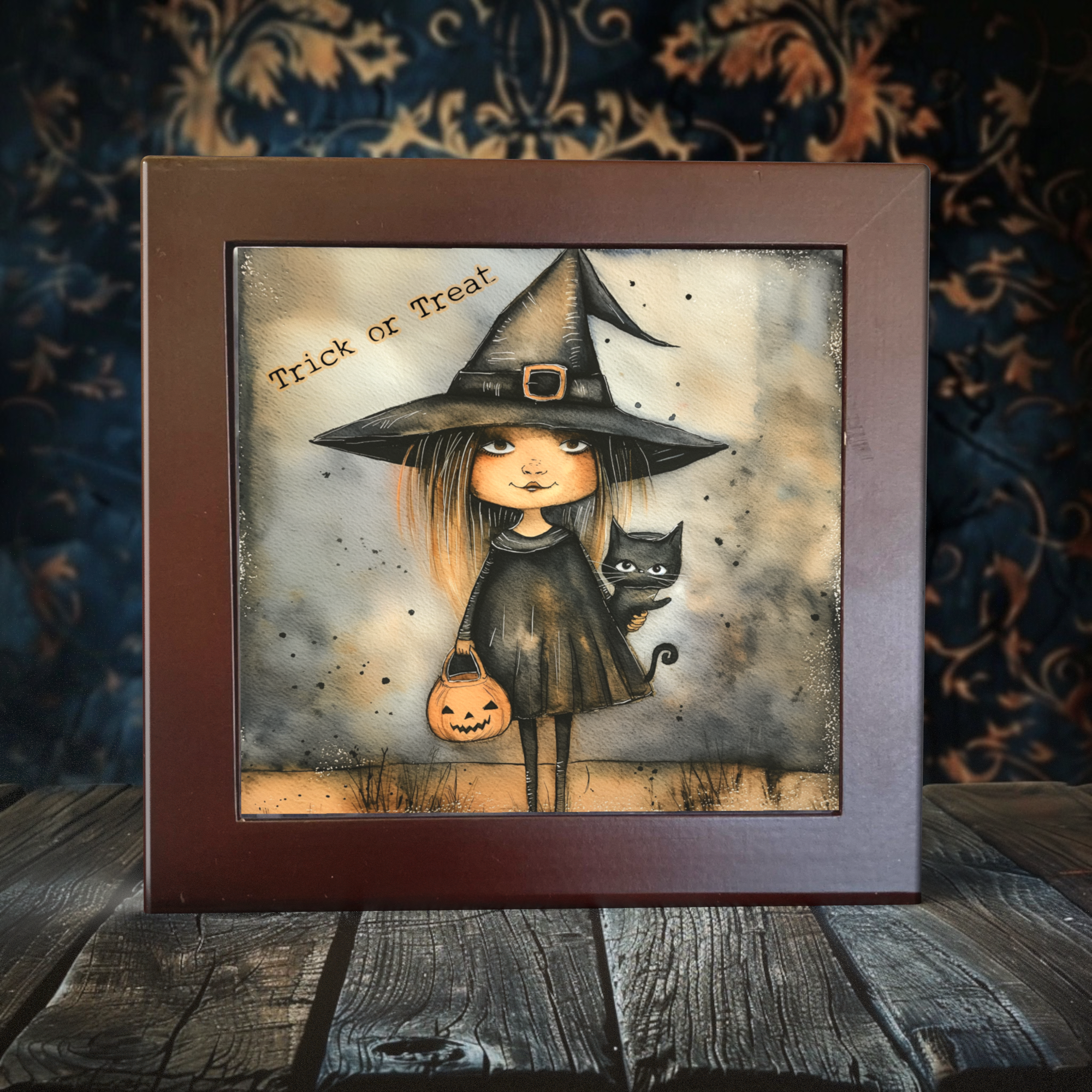 Step into the enchanting world of Halloween with “Trick or Treat: Witchy Adventures,” a captivating artwork meticulously reproduced on premium porcelain tiles using advanced UV printing technology. Available in both 6-inch and 4-inch square sizes, this delightful piece features a young witch with her black cat, ready for a night of trick-or-treating. The artwork captures the magical essence of Halloween with exceptional clarity and detail, matching the quality of Tad Hartmann’s Original.