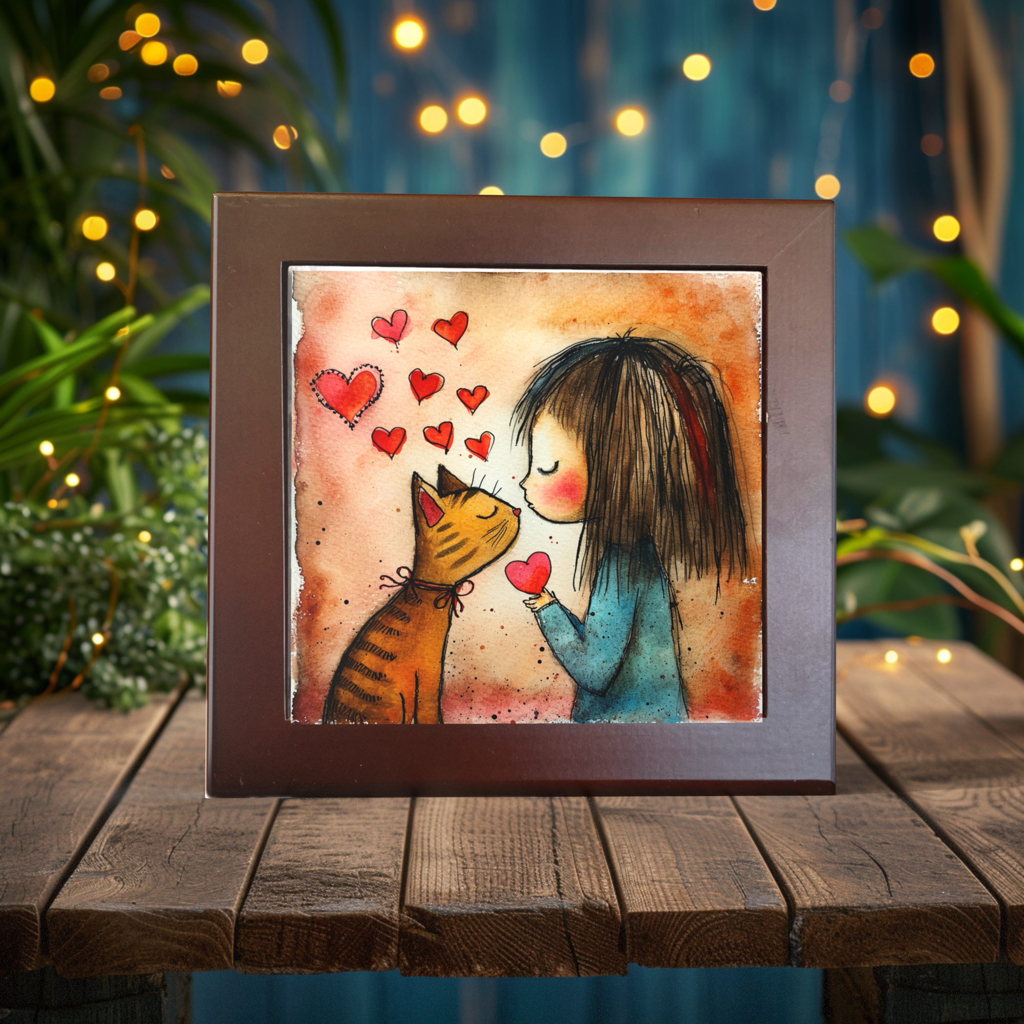 Embrace the warmth of love with our "Whiskers & Wishes: A Purr-fect Love" ceramic tile, a heartwarming addition to any home that cherishes the sweet companionship of our feline friends. This original artwork captures the tender moment between a young girl and her beloved cat, symbolizing the unconditional love and affection that pets bring into our lives.