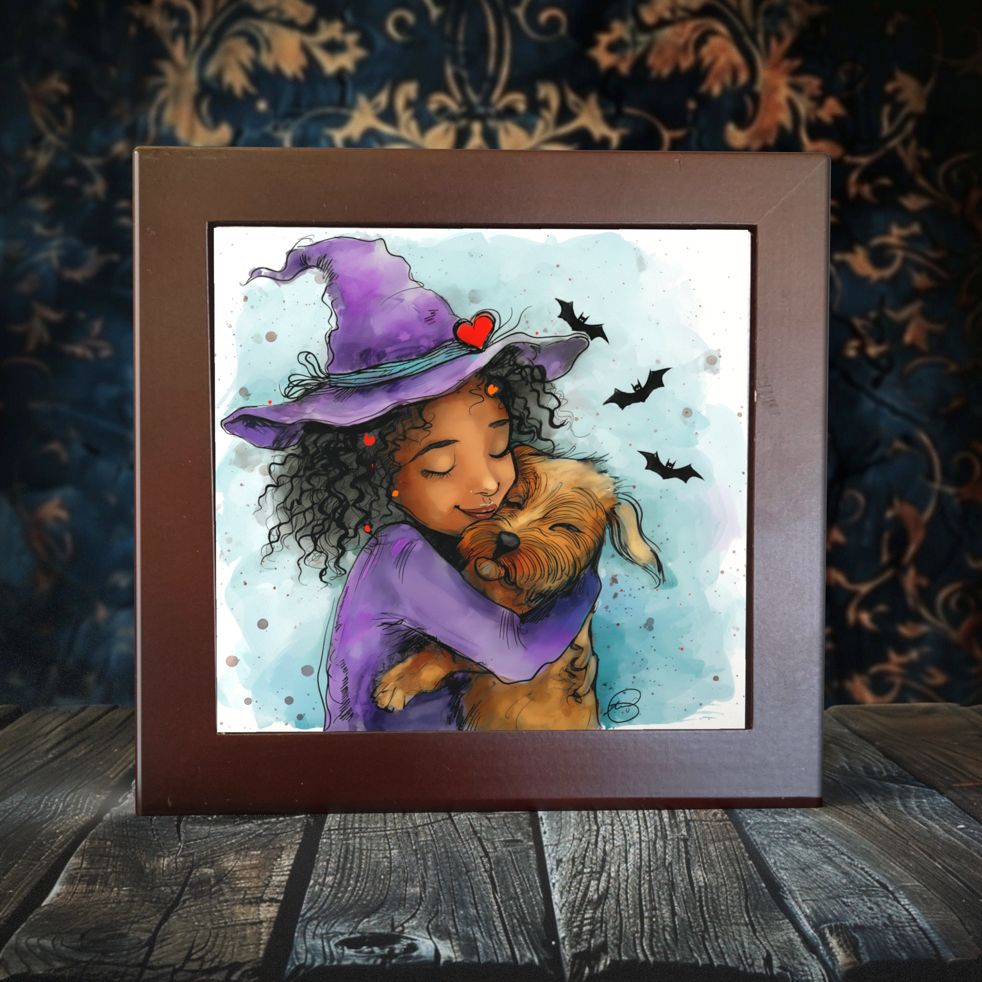 Celebrate the magic of Halloween with “Witch’s Best Friend: Halloween Hug,” a heartwarming artwork meticulously reproduced on premium porcelain tiles using advanced UV printing technology. Available in both 6-inch and 4-inch square sizes, this delightful piece features a young witch in a purple hat embracing her loyal dog, surrounded by playful bats and a sprinkle of hearts. The artwork captures the enchanting essence of Halloween with exceptional clarity and detail, matching the quality of Tad Hartmann’s masterpieces.