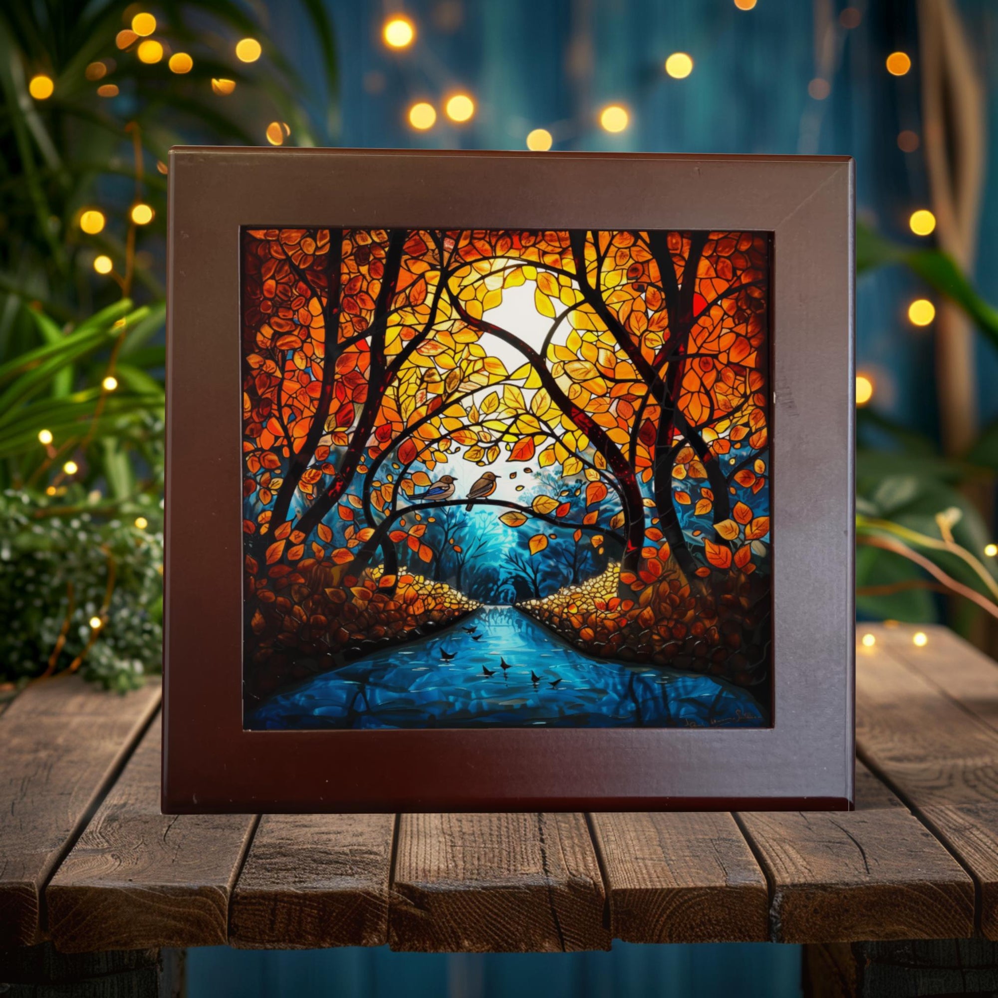 Each high-quality porcelain tile is meticulously finished with a blend of matte and gloss effects, enhancing the vivid colors and natural textures of the design. Whether displayed in a cherry wood frame, on a black metal easel, or standing alone, this tile brings the beauty and serenity of autumn into your home.