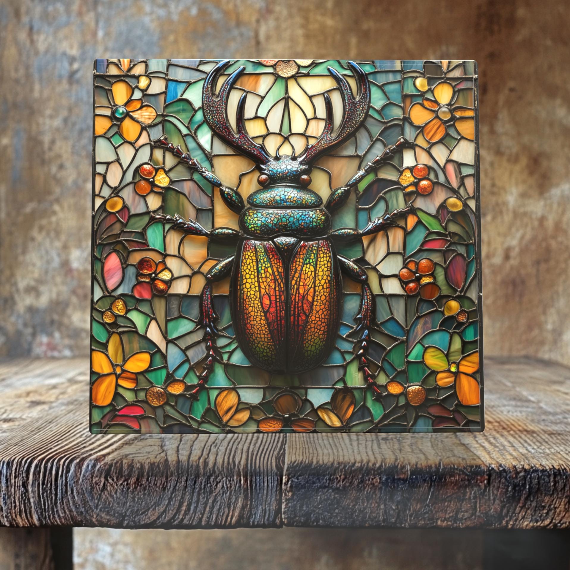 Rainbow Jewel Beetle Porcelain Tile – Stained Glass-Style Insect Art