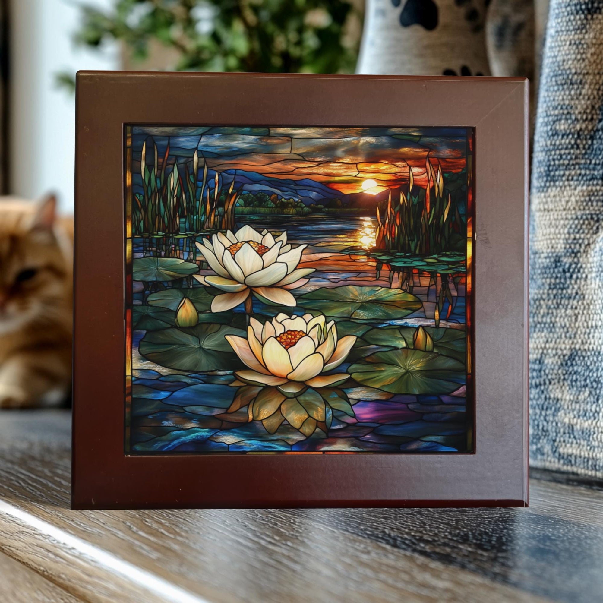 This beautifully crafted porcelain tile captures the tranquil beauty of a sunset reflecting over a peaceful lily pond, with soft white water lilies blooming in the foreground and vibrant reeds lining the horizon. Designed in a stained glass-inspired style, the original artwork by Tad Hartmann is brought to life through 5 to 8 layers of gloss and matte inks, creating a richly textured surface that glows with depth and dimension.