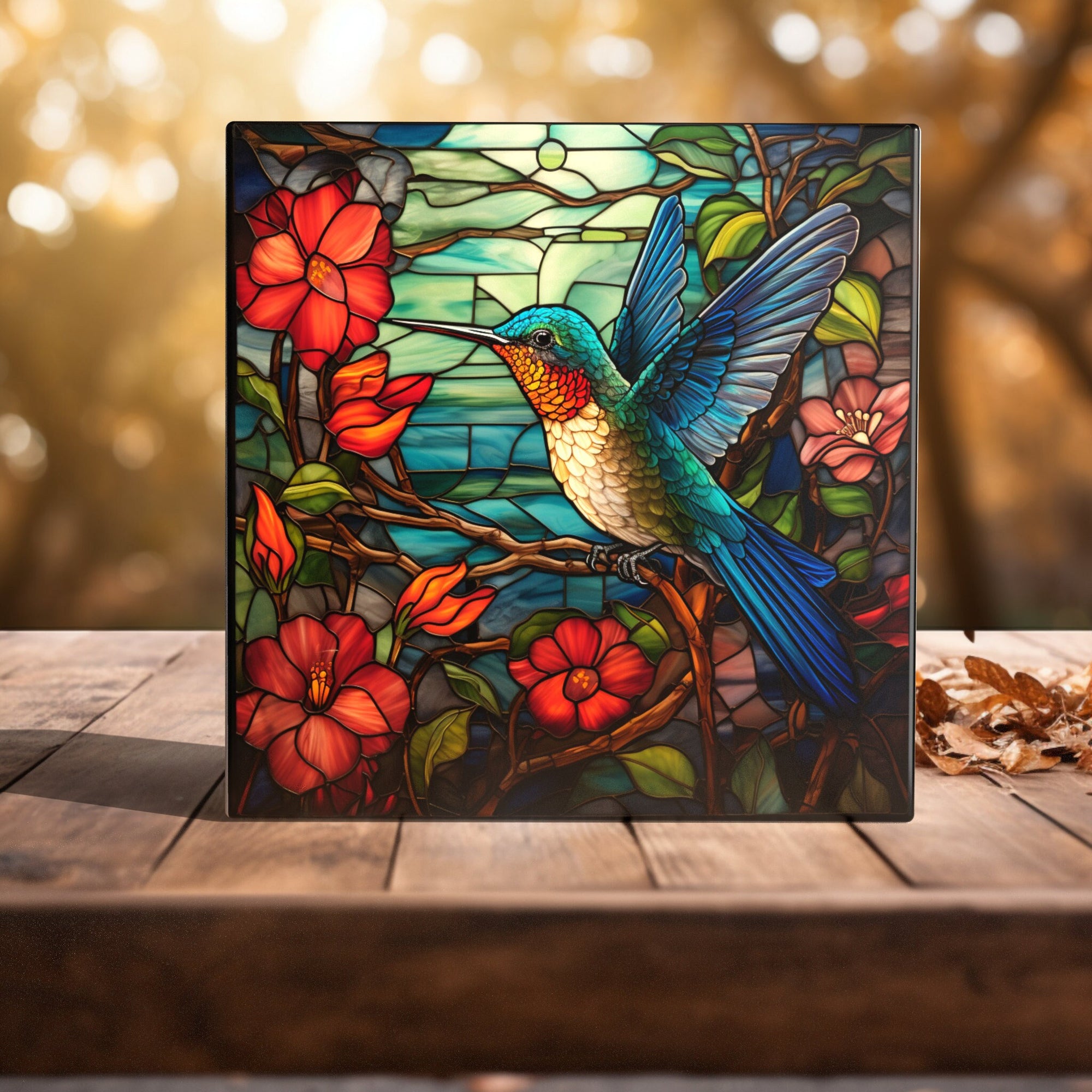 Vibrant Garden Symphony - Handcrafted Stained Glass Hummingbird Art Tile for Enchanting Home Decor