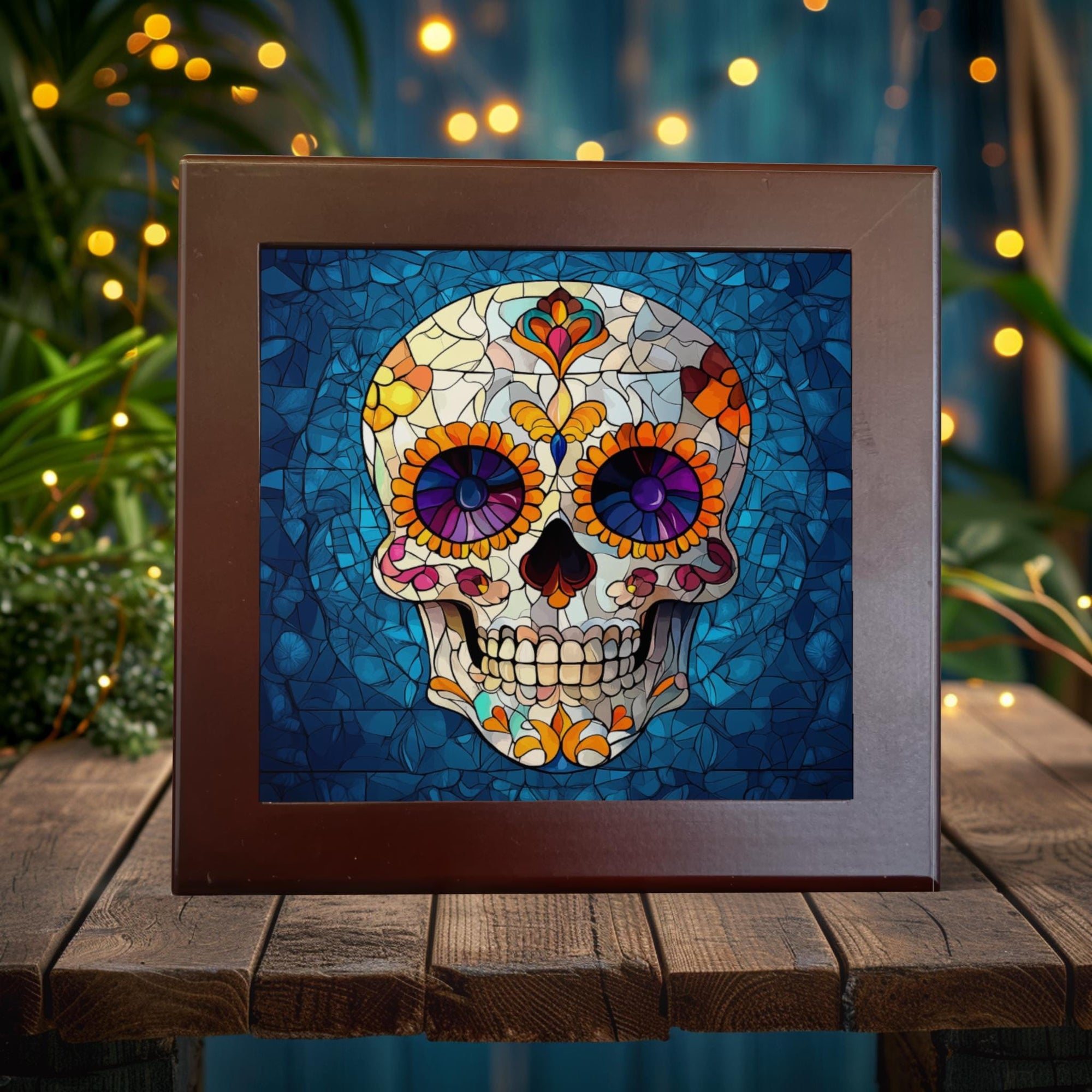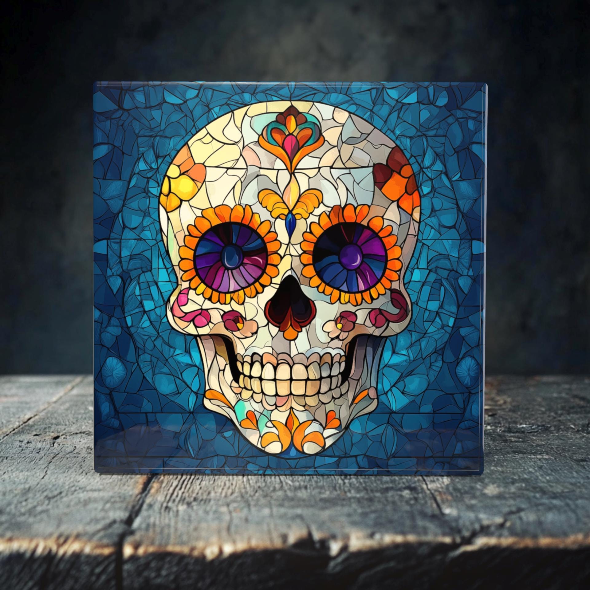 Vibrant Sugar Skull Porcelain Tile Art - Day of the Dead Decor