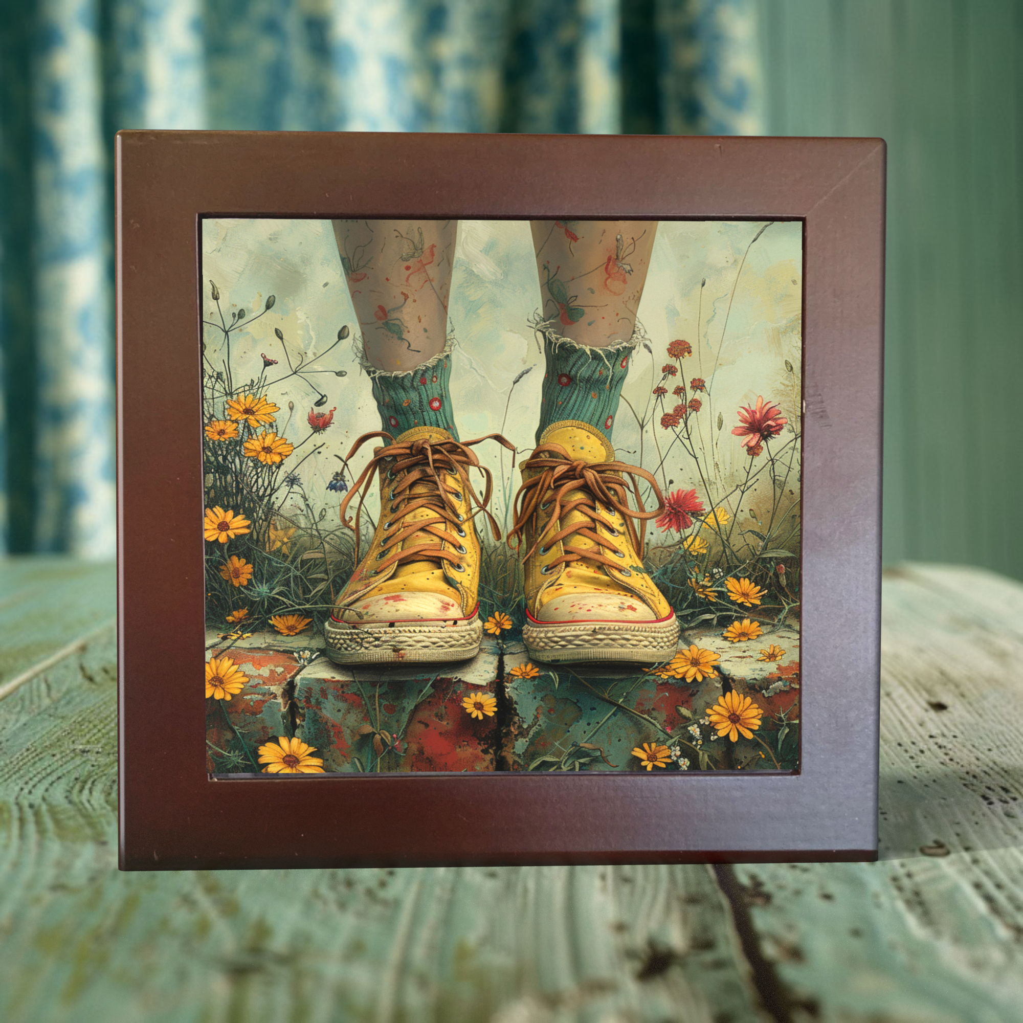 Rustic Yellow Shoes in Blooming Garden -Porcelain Tile Art
