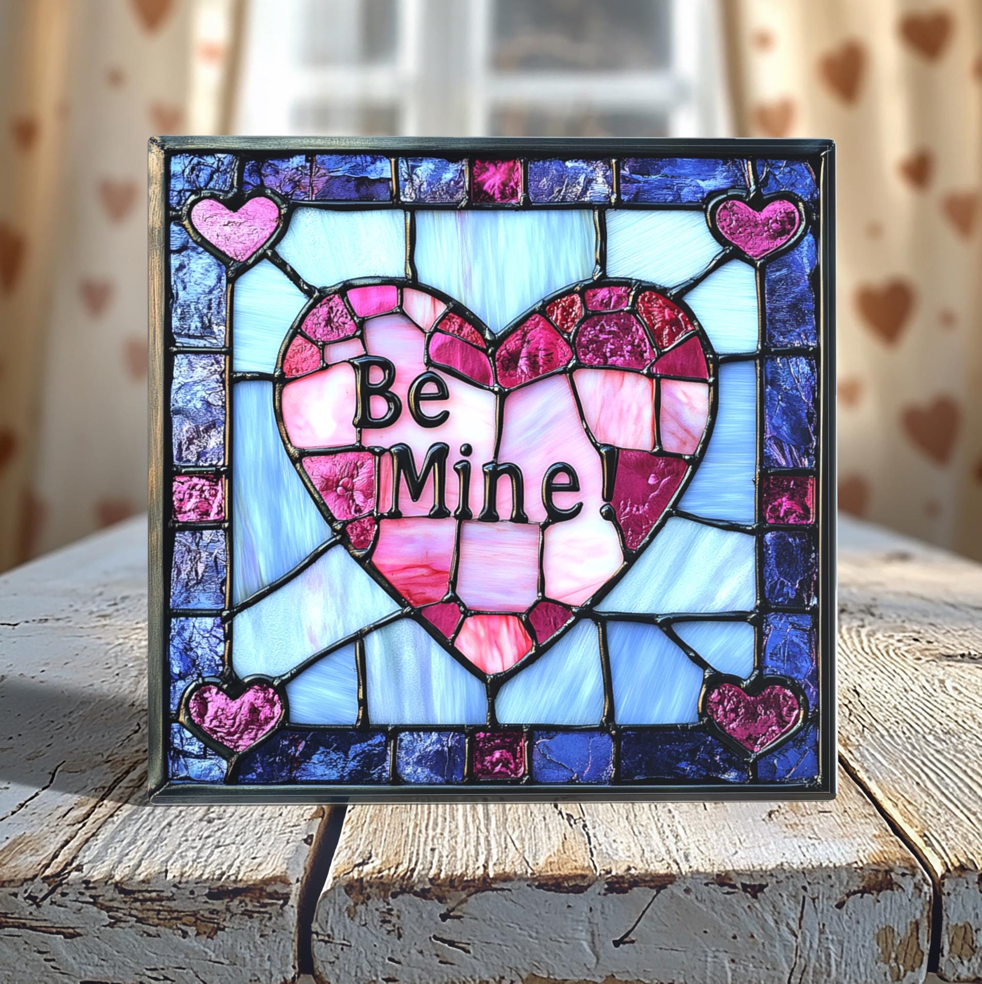 Celebrate love with this “Be Mine!” ceramic tile, crafted to resemble the timeless beauty of stained glass. This stunning design features a vibrant pink heart framed by intricate blue and purple accents, making it a standout piece for Valentine’s Day or year-round decor. Though it looks like stained glass, it’s actually a durable porcelain tile with vivid artwork and a matte and gloss finish. Available in 4-inch or 6-inch sizes, this tile is perfect for gifting or adding a romantic touch to your home. Display it on a black metal easel, in a cherry wood frame, or as a stand-alone decor piece from Peeping Tom’s Cottage.