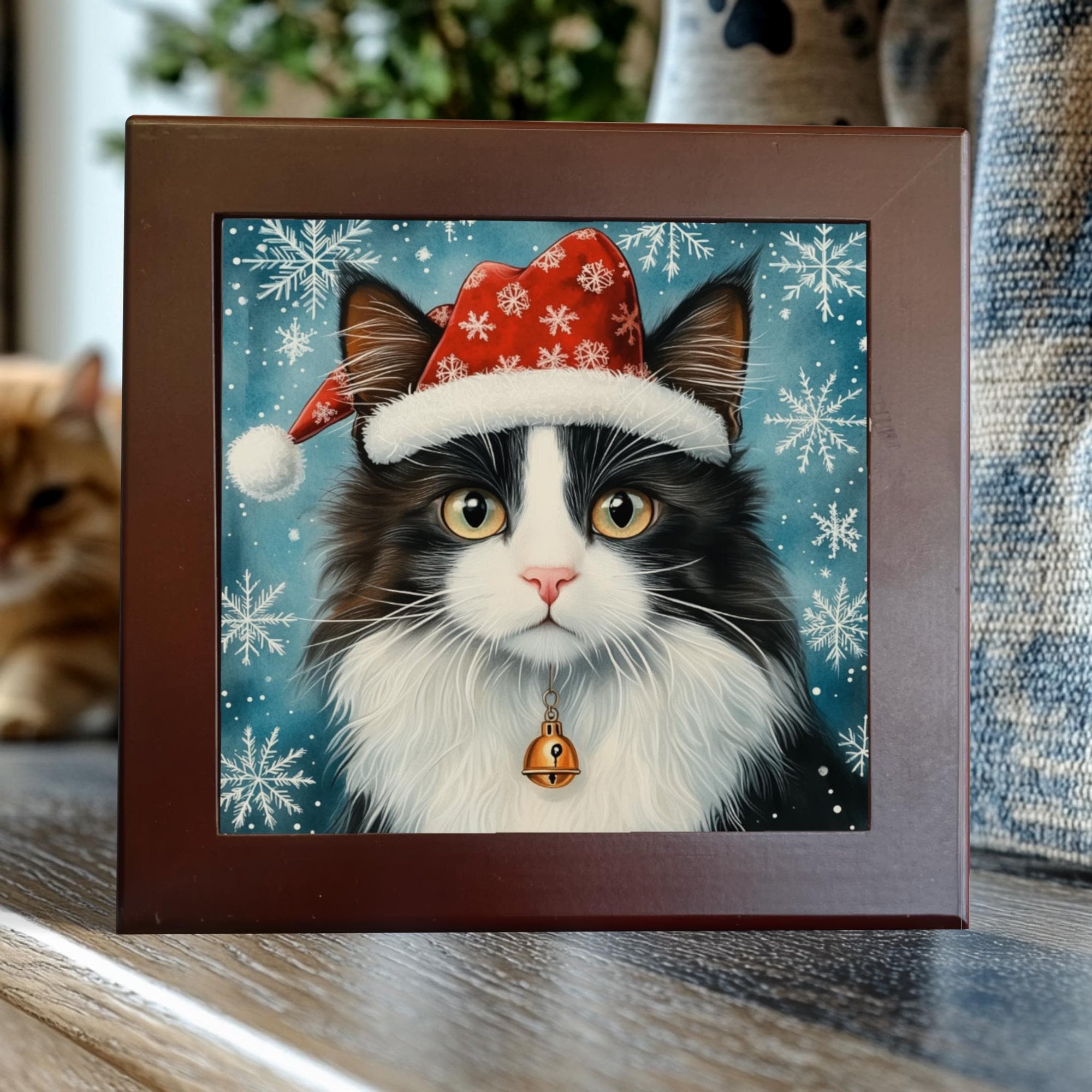 Black and White Longhair Cat with Bell – Christmas Cat Porcelain Tile
