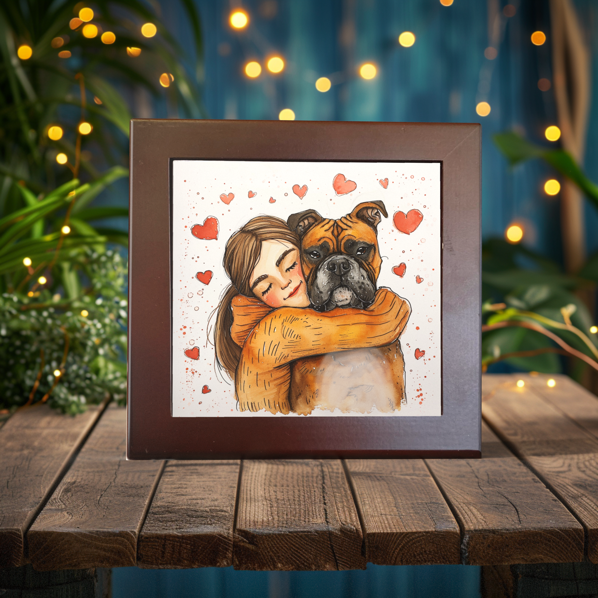 The tile features charming watercolor illustrations, where vibrant hearts float amidst a shower of tender splatters, symbolizing the love that rains down on those who cherish their pets. The expressive eyes of the boxer and the peaceful smile of the girl tell a story of friendship and love that is universally understood.