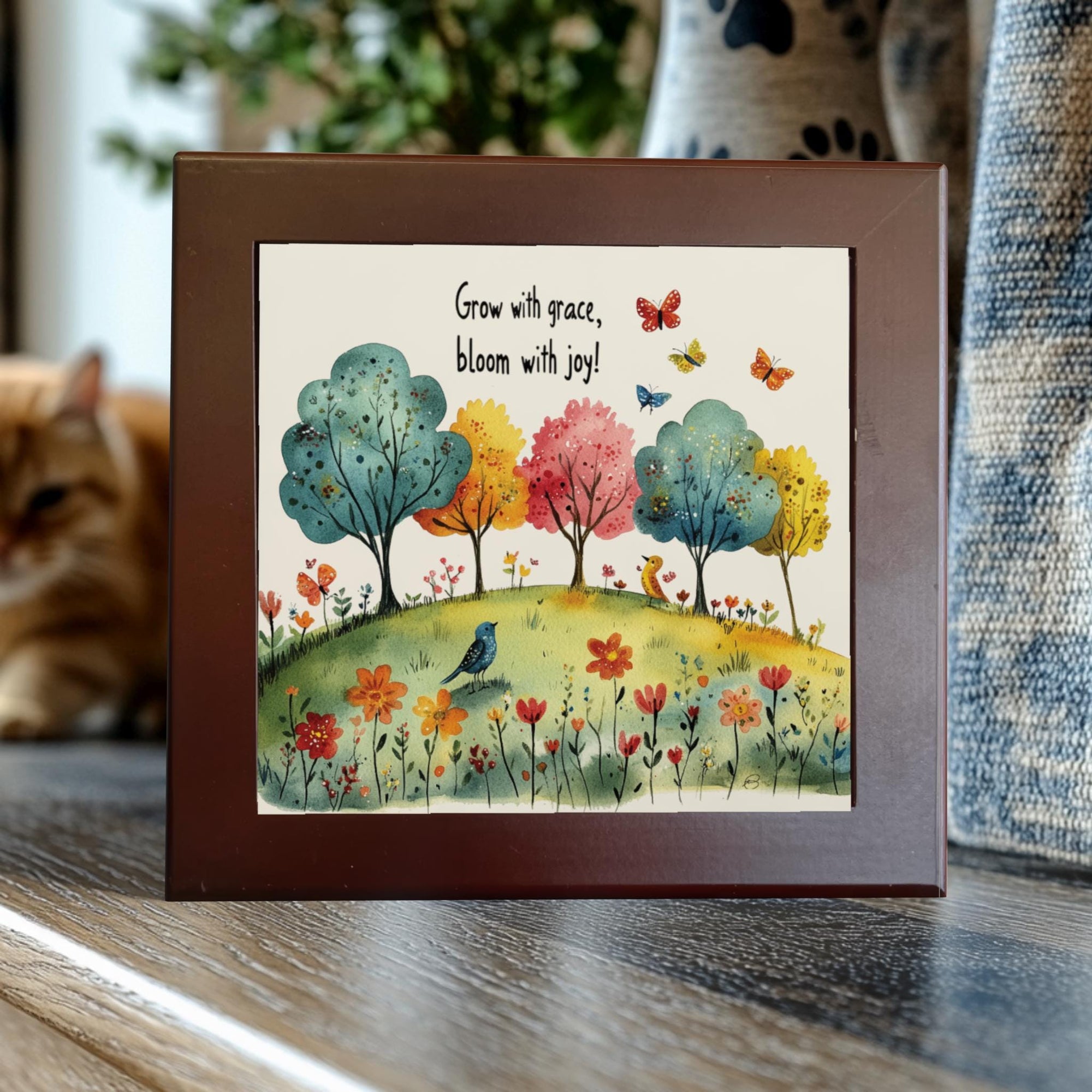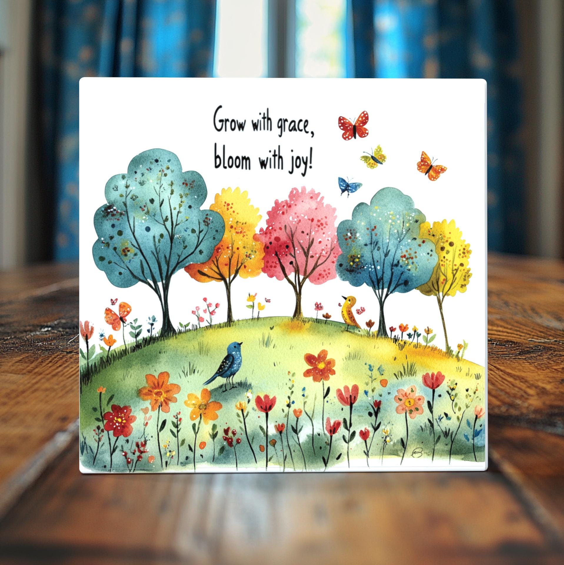 Bring the beauty of growth and joy into your home with this handcrafted ceramic tile featuring vibrant nature-inspired artwork. The uplifting message, “Grow with grace, bloom with joy!”, adds a touch of positivity to any space.