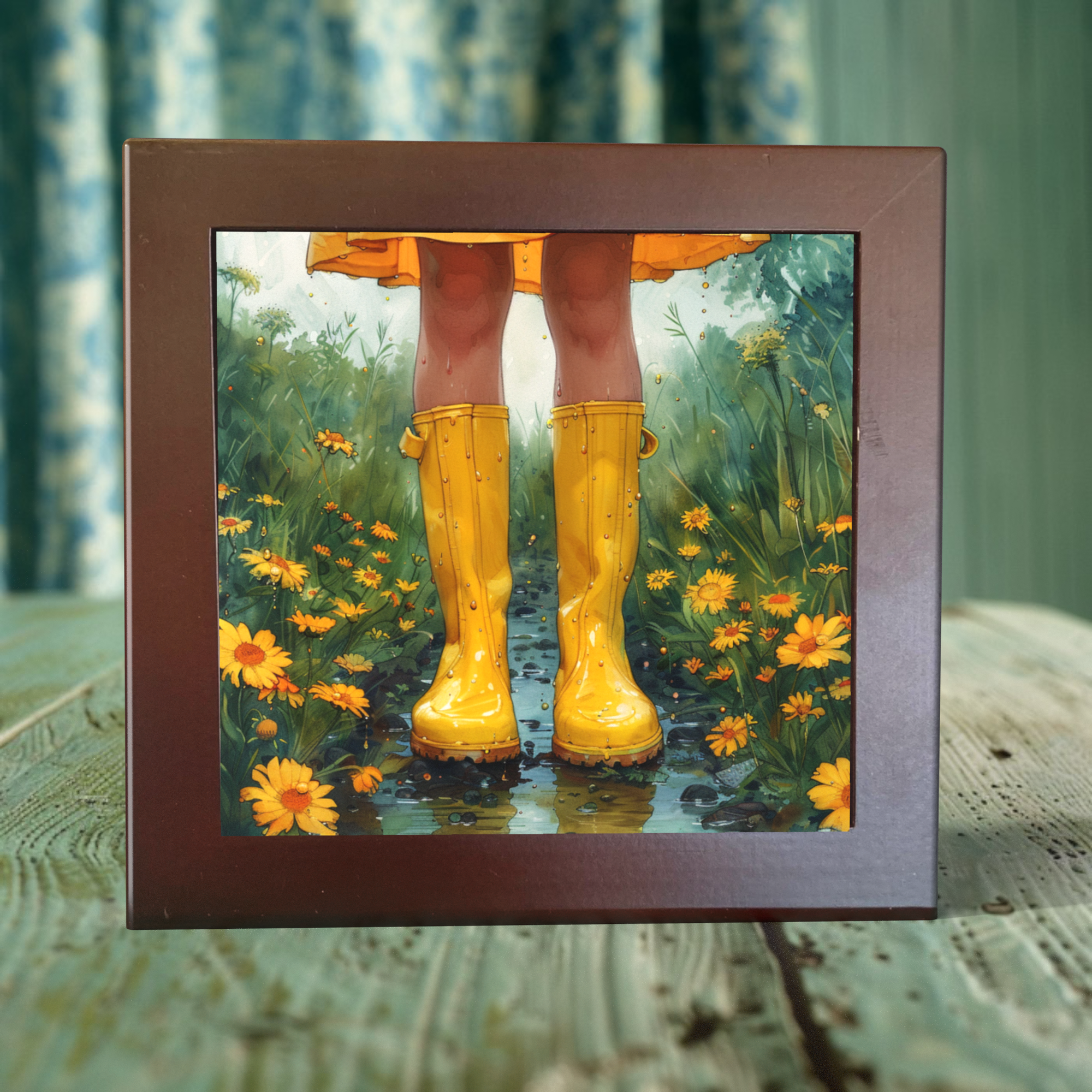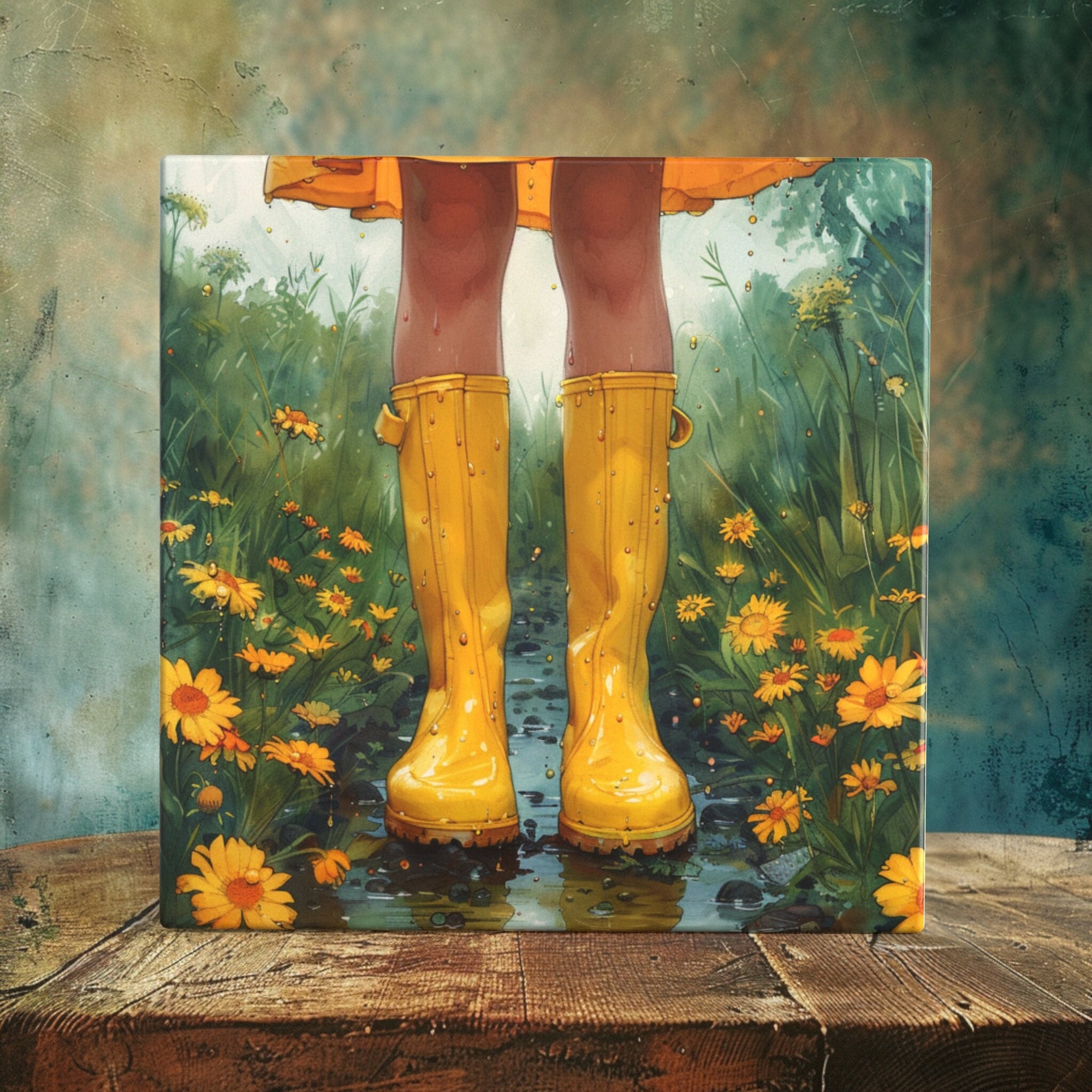 Add a touch of whimsy and nature-inspired charm to your home decor with "Yellow Rain Boots in Blooming Garden.” This original artwork is meticulously reproduced in house using UV printing on premium porcelain tiles, available in both 6-inch and 4-inch square sizes.